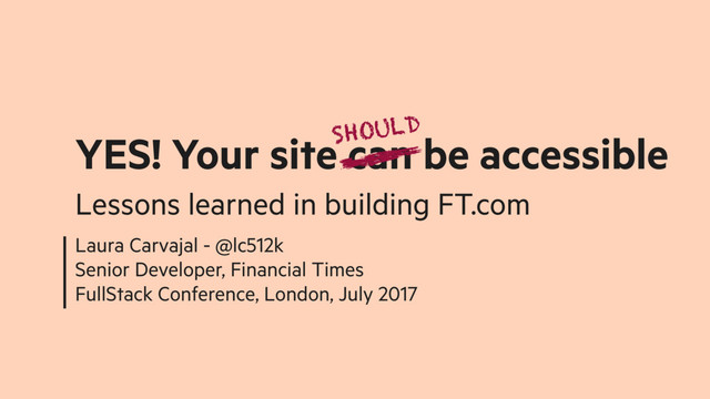 Laura Carvajal explains how her team introduced accessibility to the Financial Times website, FT.com—and their journey from being generally oblivious about accessibility to making it a core part of their process across multiple divisions. Laura shares the the roadblocks encountered and lessons learned along the way as well as practical solutions you can implement in your project today, regardless of available time, resources, or support.