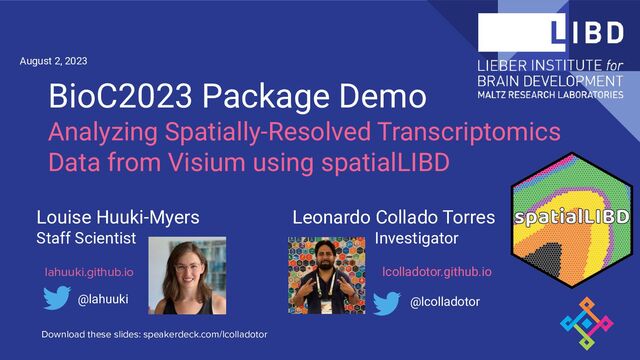 Weber @stephaniehicks Stephanie C Hicks @abspangler Abby Spangler @martinowk Keri Martinowich @CerceoPage Stephanie C Page @kr_maynard Kristen R Maynard @lcolladotor Leonardo Collado-Torres @Nick-Eagles (GH) Nicholas J Eagles Kelsey D Montgomery Sang Ho Kwon Image Analysis Expression Analysis Data Generation Thomas M Hyde @lahuuki Louise A Huuki-Myers @BoyiGuo Boyi Guo @mattntran Matthew N Tran @sowmyapartybun Sowmya Parthiban Slides available at speakerdeck.com /lcolladotor + Many more LIBD, JHU, and external collaborators @mgrantpeters Melissa Grant-Peters @prashanthi-ravichandran (GH) Prashanthi Ravichandran