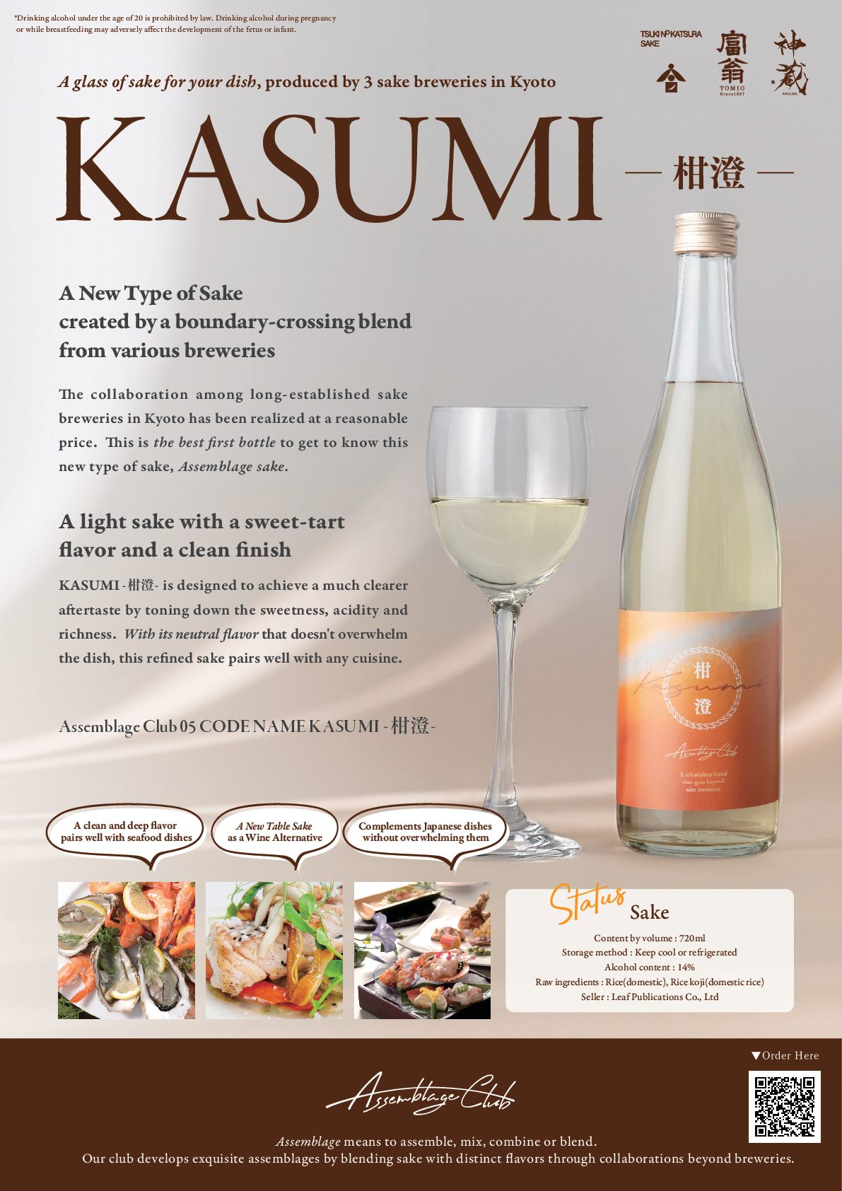 realized at a reasonable price. is is the best rst bottle to get to know this new type of sake, Assemblage sake. A light sake with a sweet-tart avor and a clean nish Assemblage means to assemble, mix, combine or blend. Our club develops exquisite assemblages by blending sake with distinct avors through collaborations beyond breweries. *Drinking alcohol under the age of 20 is prohibited by law. Drinking alcohol during pregnancy or while breastfeeding may adversely a ect the development of the fetus or infant. ˝0SEFS)FSF KASUMIᴷᴷ A clean and deep avor pairs well with seafood dishes A New Table Sake as a Wine Alternative Complements Japanese dishes without overwhelming them Assemblage Club 05 CODE NAME KASUMI Sake Content by volume : 720ml Storage method : Keep cool or refrigerated Alcohol content : 14% Raw ingredients : Rice(domestic), Rice koji(domestic rice) Seller : Leaf Publications Co., Ltd Status A glass of sake for your dish, produced by 3 sake breweries in Kyoto A New Type of Sake created by a boundary-crossing blend from various breweries KASUMI is designed to achieve a much clearer a ertaste by toning down the sweetness, acidity and richness. With its neutral avor that doesn't overwhelm the dish, this re ned sake pairs well with any cuisine.