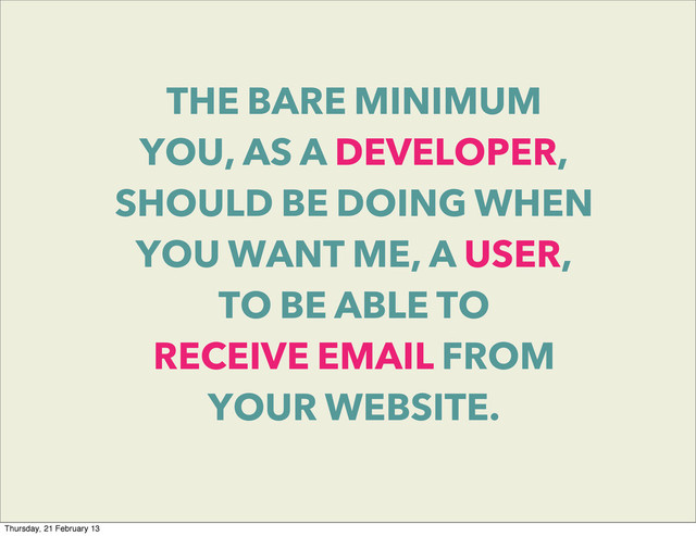 Email is everywhere, email is in everything and the chances are you're doing it wrong. We cover the very least you should be doing to ensure your application's email is getting to its target, how to talk to ESPs and some common mistakes to avoid for developers, designers and copywriters.