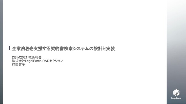 本資料は講演のために提供されるものであり、株式会社 LegalForceの事前の承諾なしに、 複写、引用または第三者に提供することはできません。 企業法務を支援する契約書検索システムの設計と実装 DEIM2021 技術報告 株式会社LegalForce R&Dセクション 打田智子