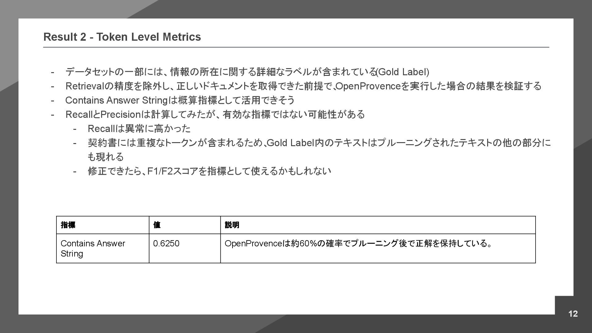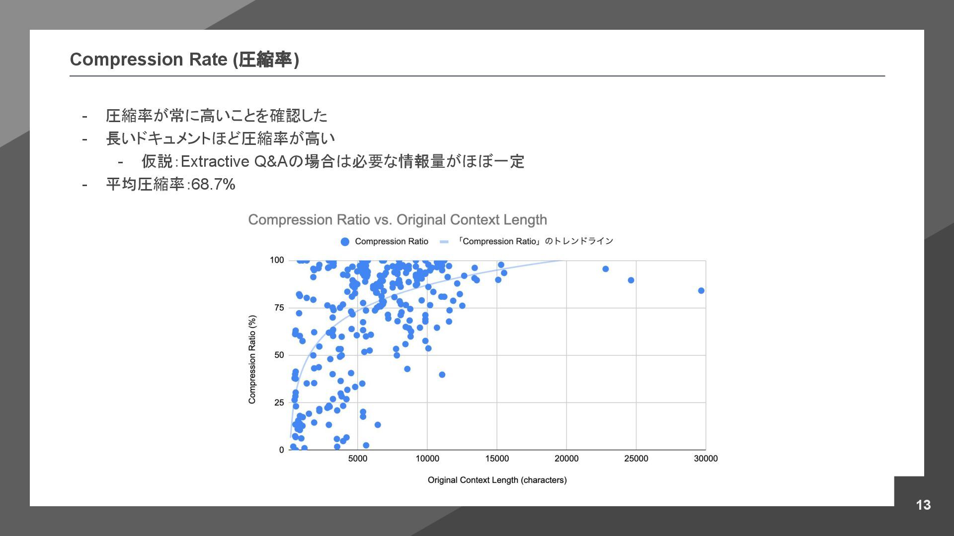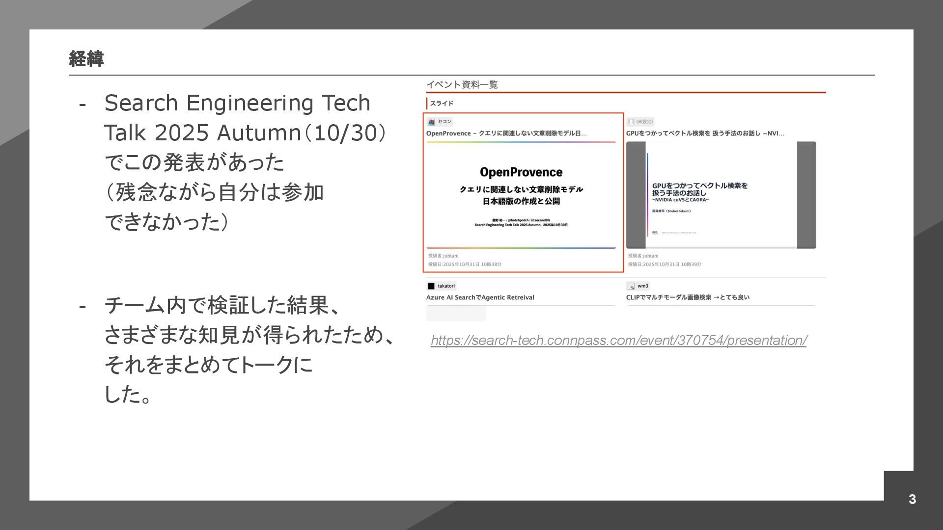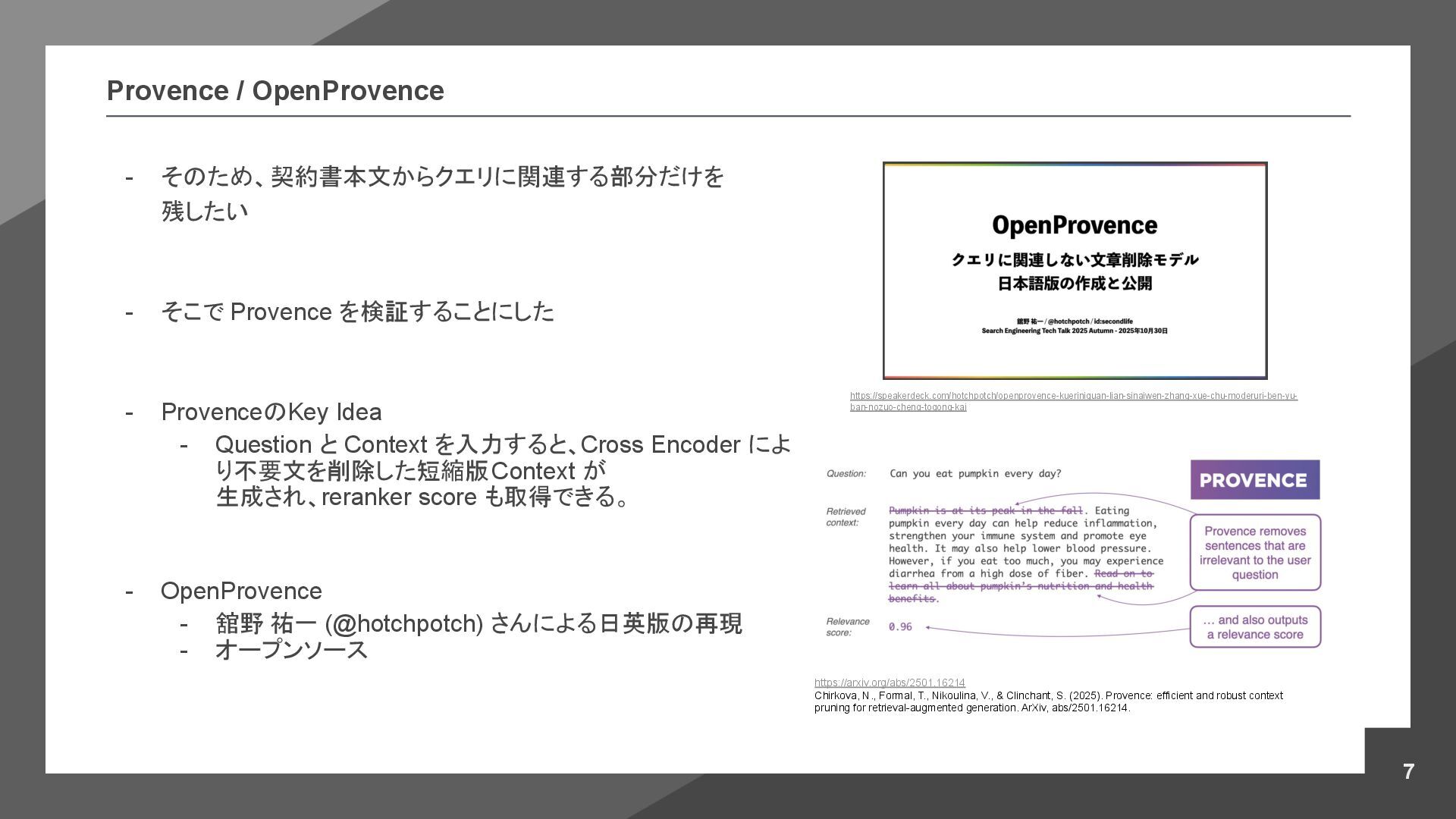 Idea - Question と Context を入力すると、Cross Encoder によ り不要文を削除した短縮版 Context が 生成され、reranker score も取得できる。 - OpenProvence - 舘野 祐一 (@hotchpotch) さんによる日英版の再現 - オープンソース Provence / OpenProvence https://speakerdeck.com/hotchpotch/openprovence-kueriniguan-lian-sinaiwen-zhang-xue-chu-moderuri-ben-yu- ban-nozuo-cheng-togong-kai https://arxiv.org/abs/2501.16214 Chirkova, N., Formal, T., Nikoulina, V., & Clinchant, S. (2025). Provence: efficient and robust context pruning for retrieval-augmented generation. ArXiv, abs/2501.16214.