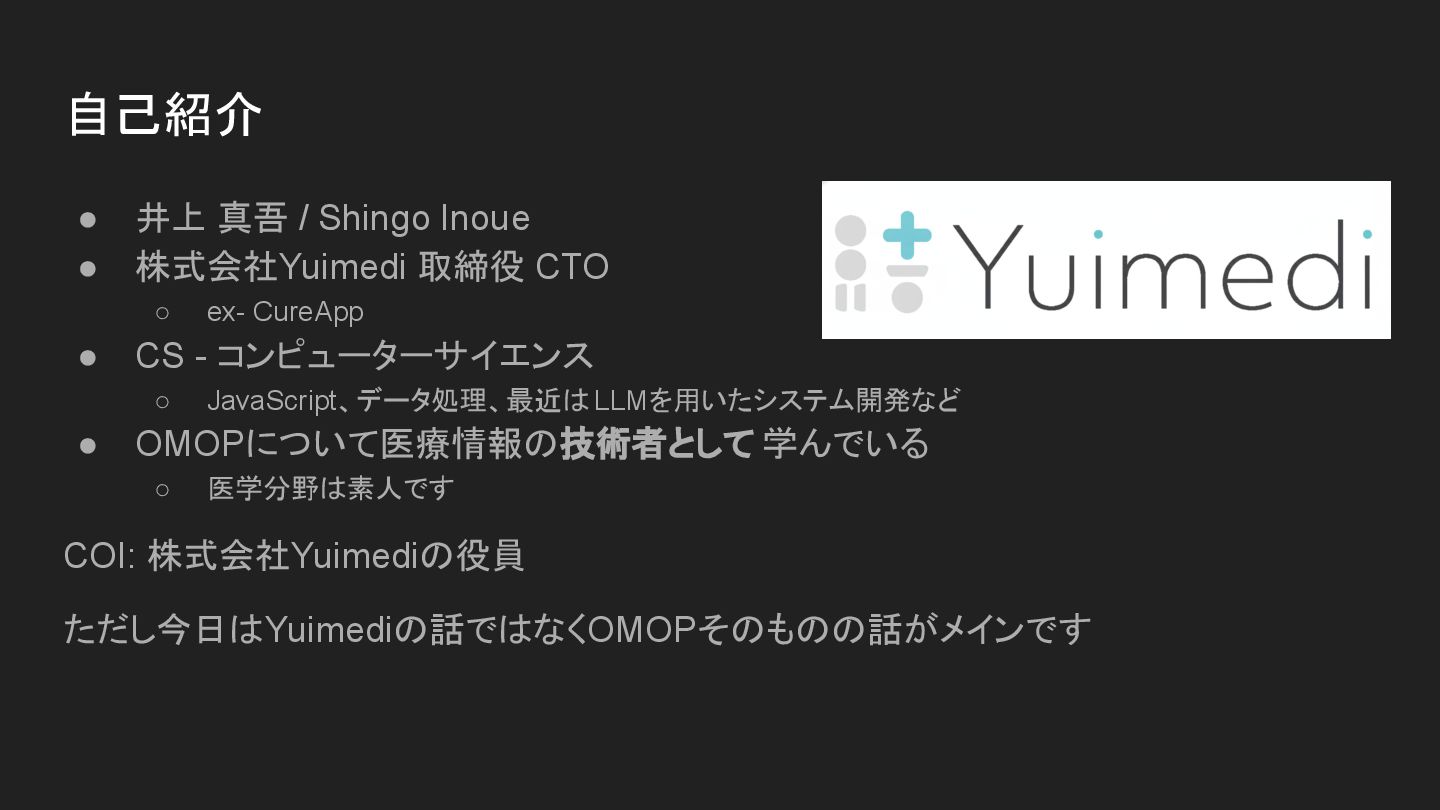 ◦ ex- CureApp • CS - コンピューターサイエンス ◦ JavaScript、データ処理、最近は LLMを用いたシステム開発など • OMOPについて医療情報の技術者として 学んでいる ◦ 医学分野は素人です COI: 株式会社Yuimediの役員 ただし今日はYuimediの話ではなくOMOPそのものの話がメインです 自己紹介