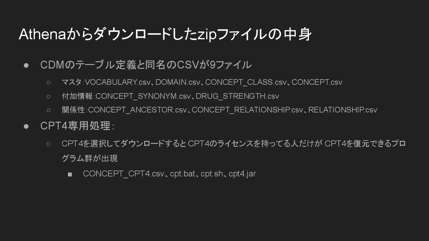 • CDMのテーブル定義と同名のCSVが9ファイル ◦ マスタ:VOCABULARY.csv、DOMAIN.csv、CONCEPT_CLASS.csv、CONCEPT.csv ◦ 付加情報:CONCEPT_SYNONYM.csv、DRUG_STRENGTH.csv ◦ 関係性:CONCEPT_ANCESTOR.csv、CONCEPT_RELATIONSHIP.csv、RELATIONSHIP.csv • CPT4専用処理: