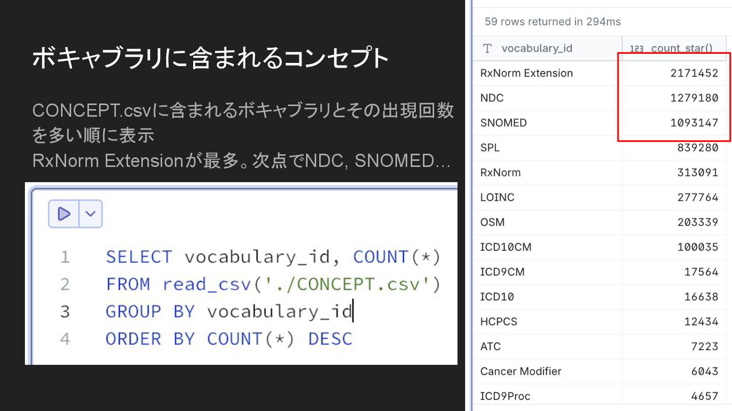 • 傷病、処方、検査あたりにフォーカスして潜ってみます ◦ 第 5 章 標準化ボキャブラリ | OHDSIの本 を読むとより理解が深まります