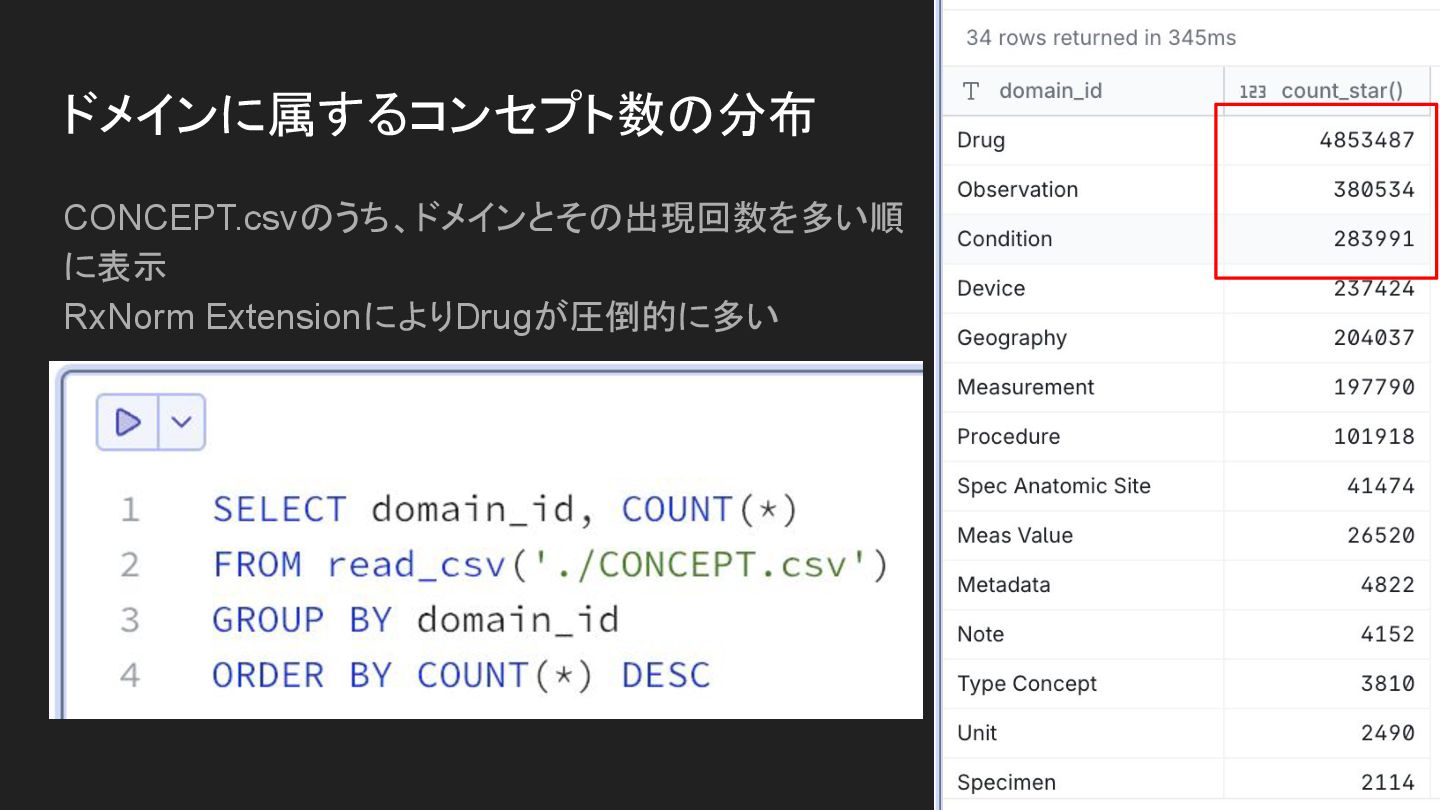 ドメインに属するコンセプト数の分布 CONCEPT.csvのうち、ドメインとその出現回数を多い順 に表示 RxNorm ExtensionによりDrugが圧倒的に多い