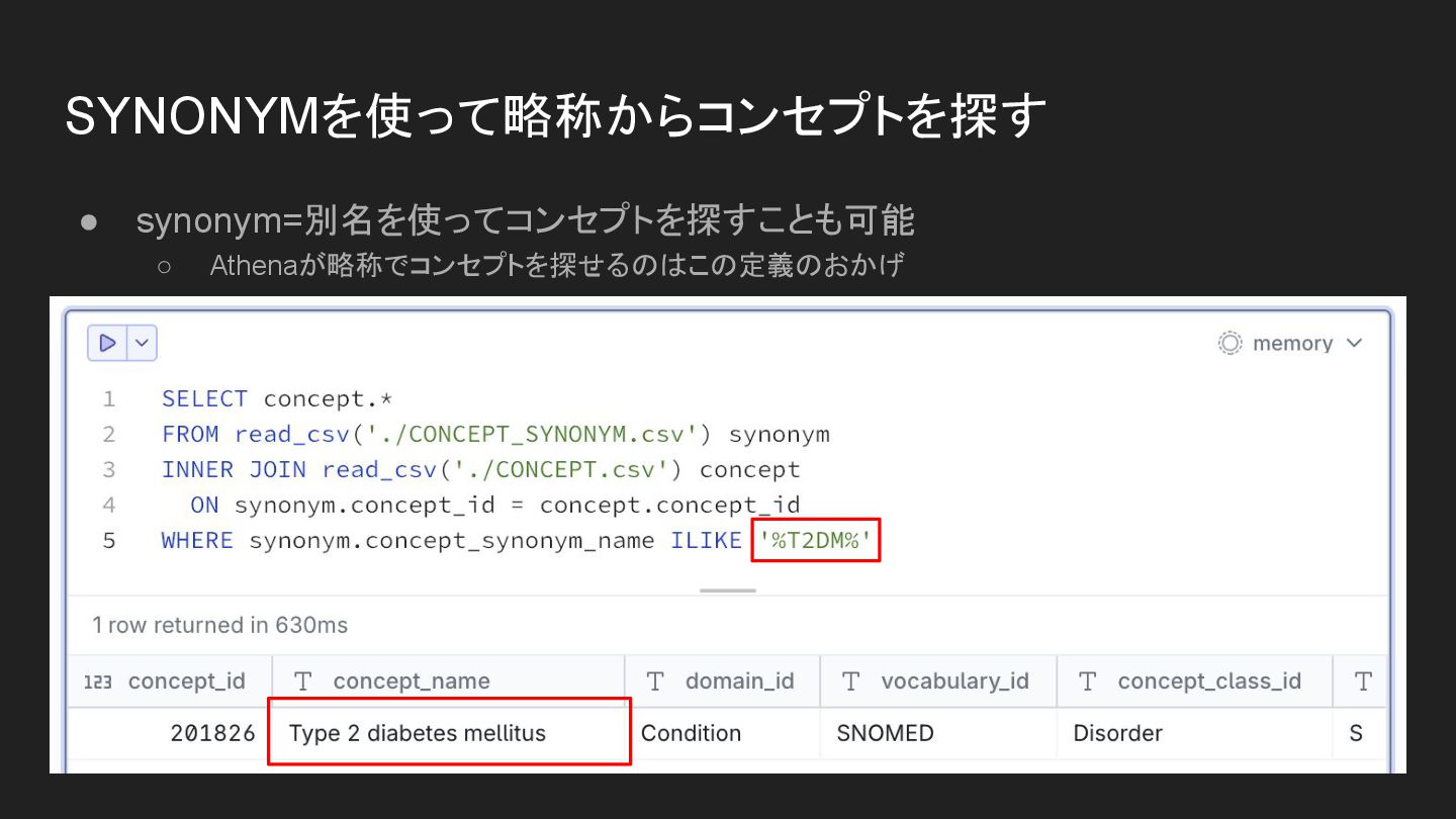 SYNONYMを使って略称からコンセプトを探す • synonym=別名を使ってコンセプトを探すことも可能 ◦ Athenaが略称でコンセプトを探せるのはこの定義のおかげ