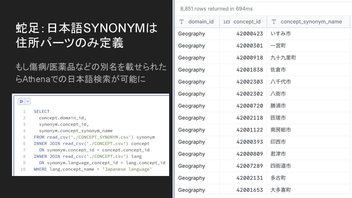 蛇足:日本語SYNONYMは 住所パーツのみ定義 もし傷病/医薬品などの別名を載せられた らAthenaでの日本語検索が可能に