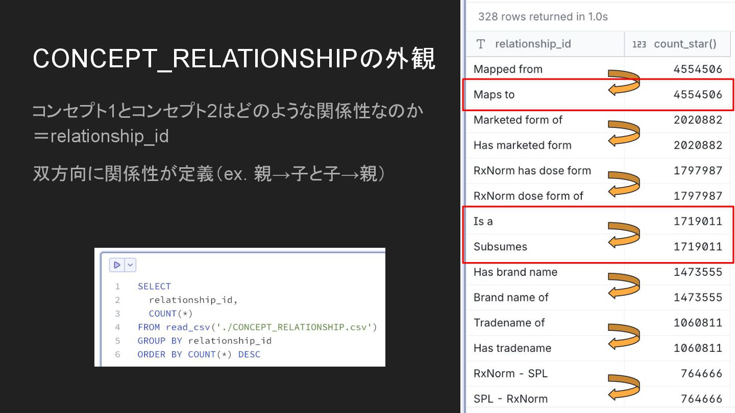 コンセプト1とコンセプト2はどのような関係性なのか =relationship_id 双方向に関係性が定義(ex. 親→子と子→親) CONCEPT_RELATIONSHIPの外観