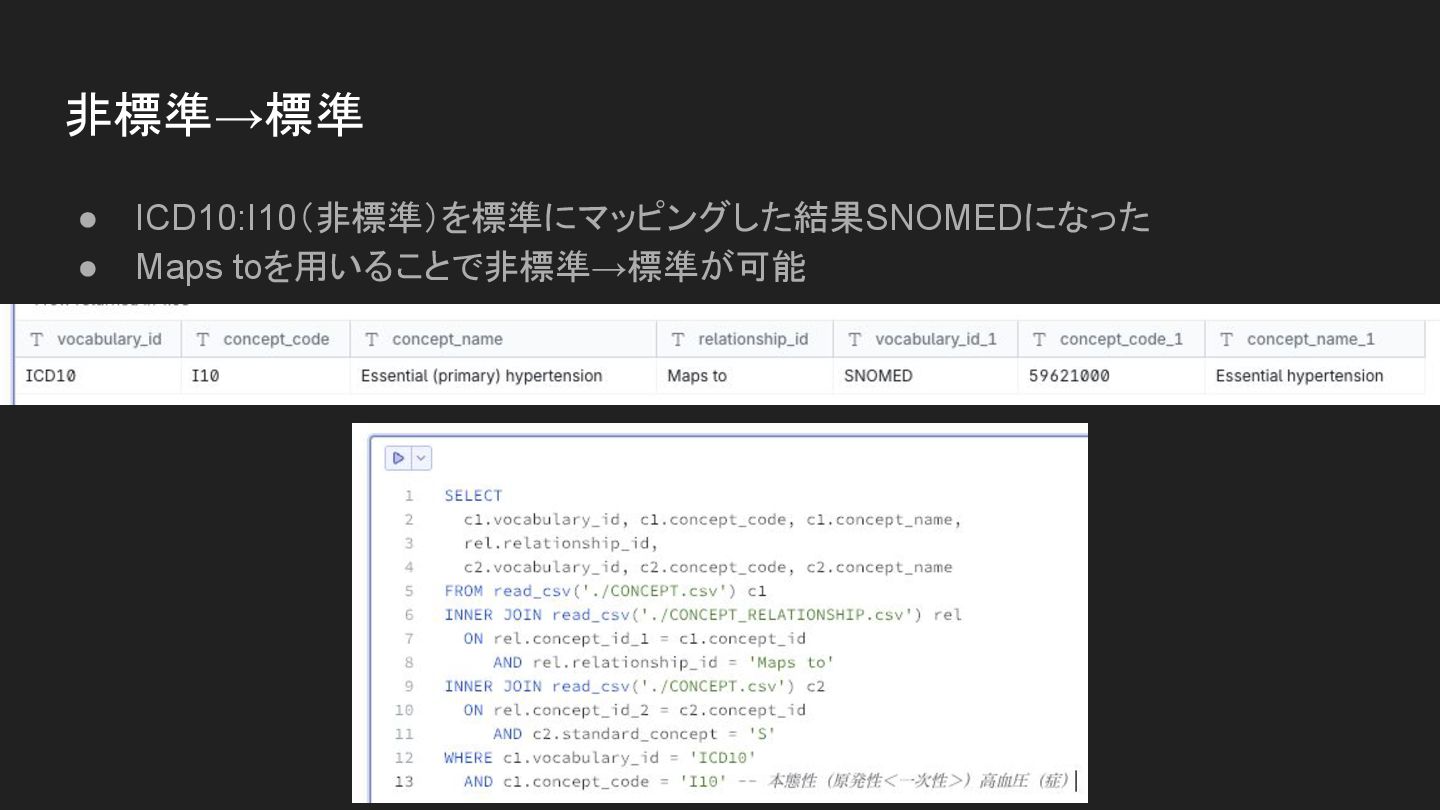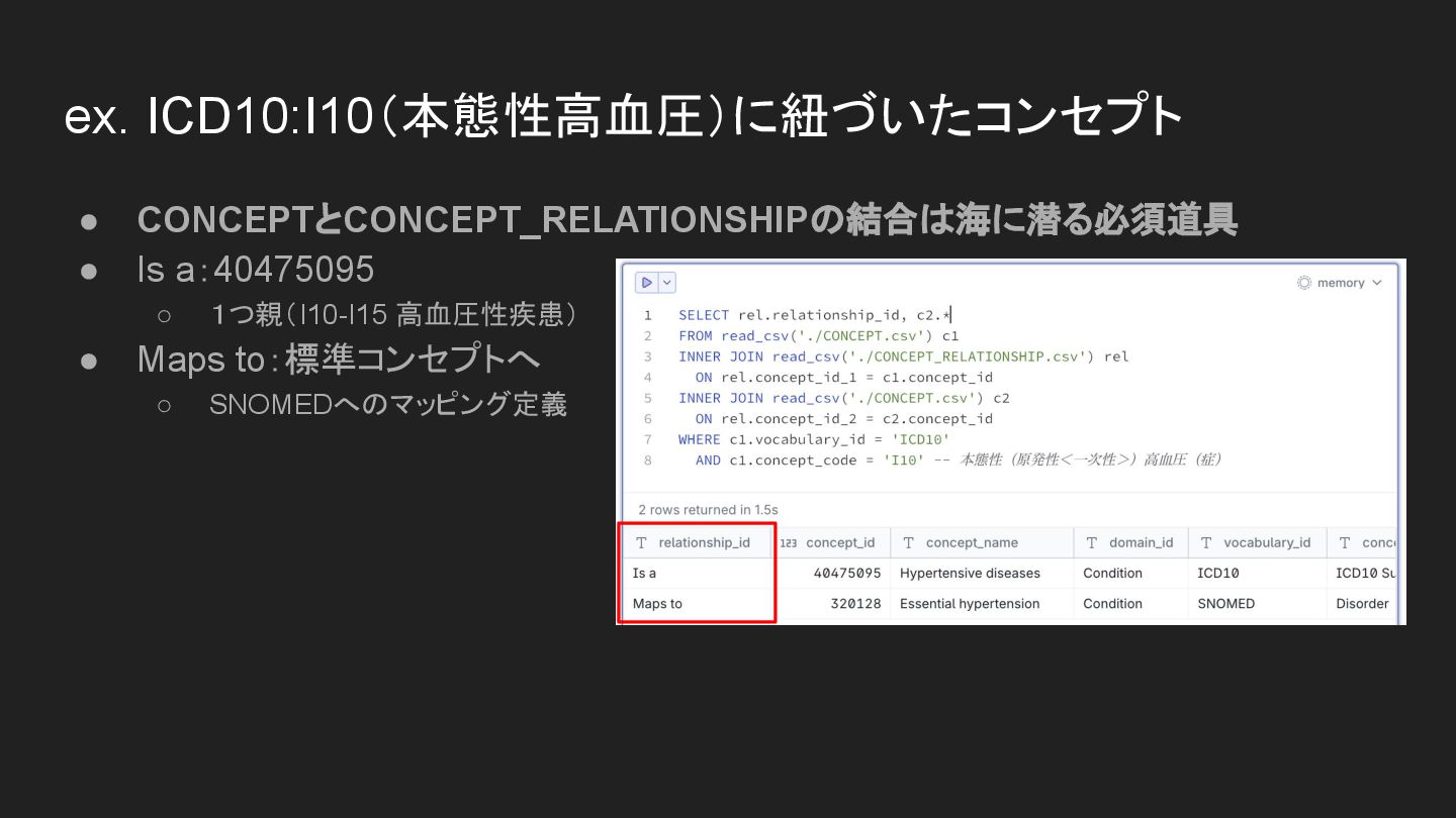 • CONCEPTとCONCEPT_RELATIONSHIPの結合は海に潜る必須道具 • Is a:40475095 ◦ 1つ親(I10-I15 高血圧性疾患) • Maps