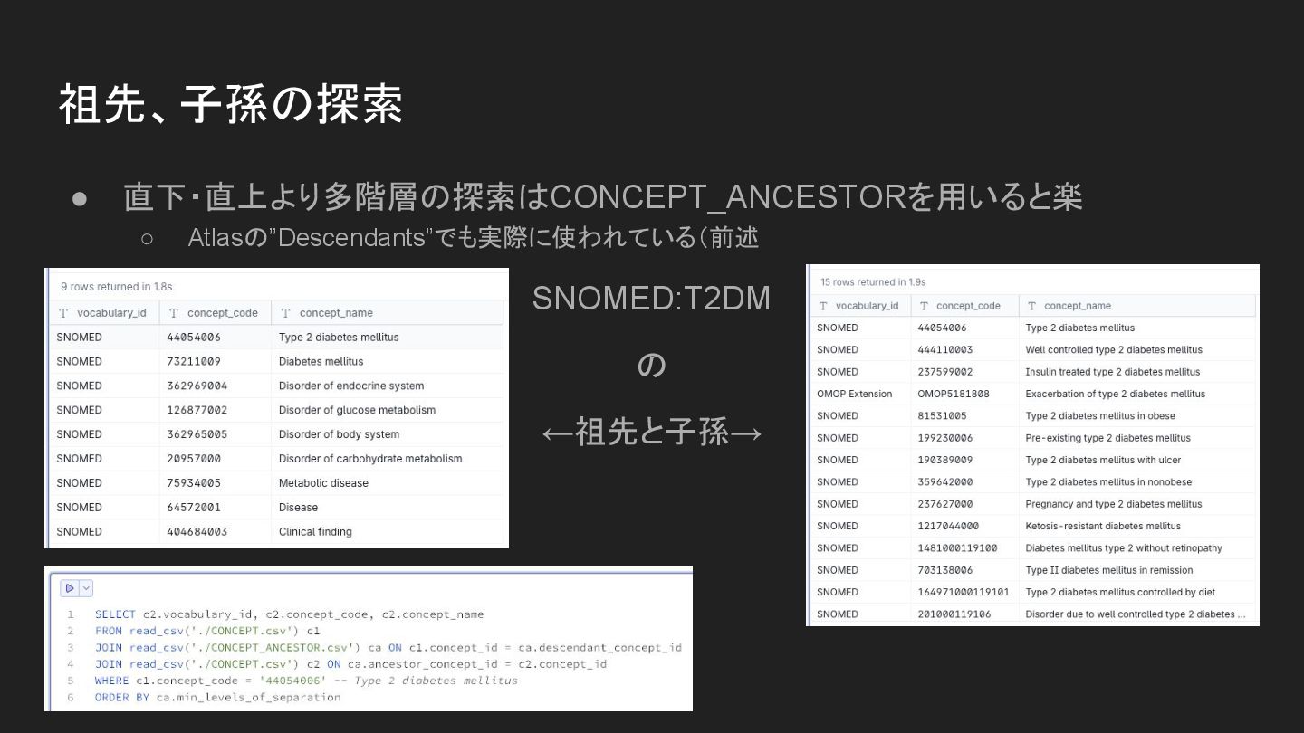 祖先、子孫の探索 • 直下・直上より多階層の探索はCONCEPT_ANCESTORを用いると楽 ◦ Atlasの”Descendants”でも実際に使われている(前述 SNOMED:T2DM の ←祖先と子孫→