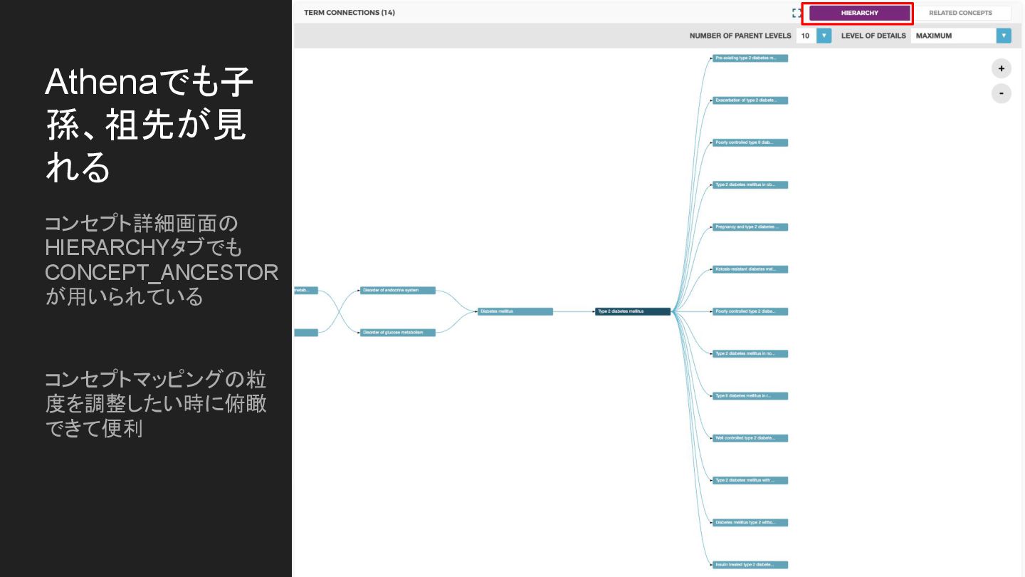 コンセプト詳細画面の HIERARCHYタブでも CONCEPT_ANCESTOR が用いられている コンセプトマッピングの粒 度を調整したい時に俯瞰 できて便利 Athenaでも子 孫、祖先が見 れる