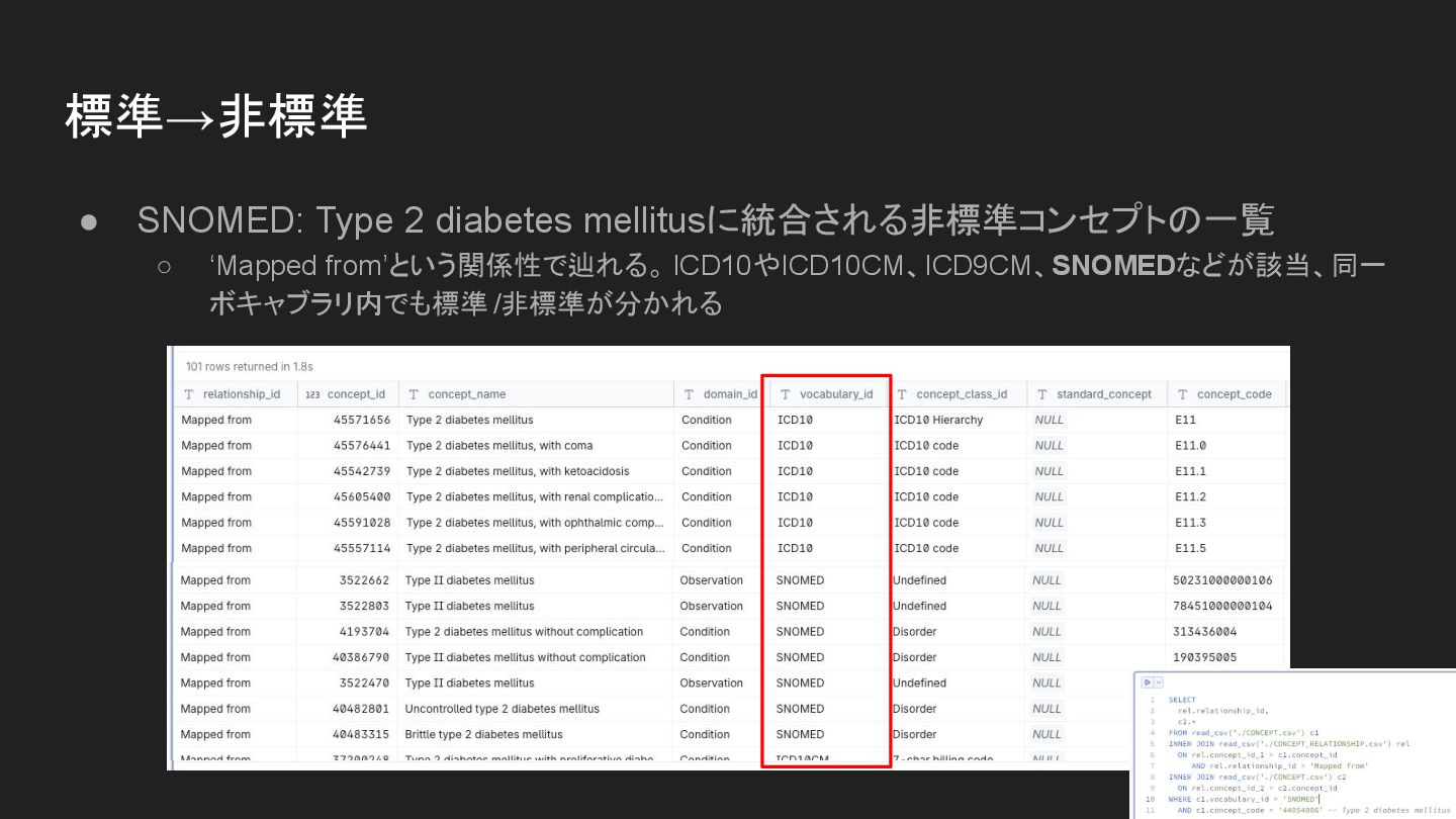• SNOMED: Type 2 diabetes mellitusに統合される非標準コンセプトの一覧 ◦ ‘Mapped from’という関係性で辿れる。 ICD10やICD10CM、ICD9CM、SNOMEDなどが該当、同一
