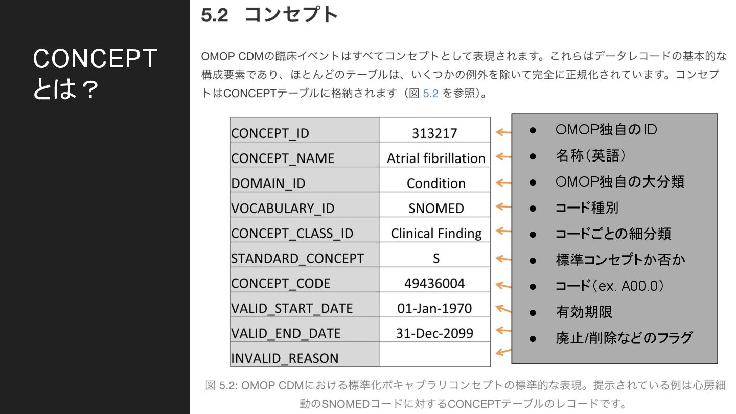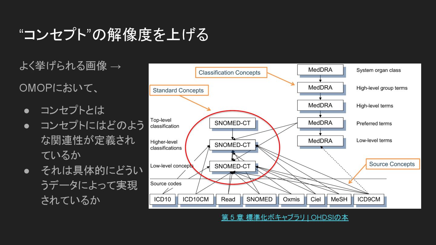 それは具体的にどうい うデータによって実現 されているか “コンセプト”の解像度を上げる 第 5 章 標準化ボキャブラリ | OHDSIの本