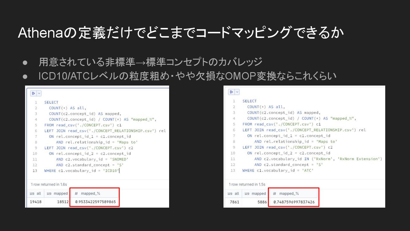 Athenaの定義だけでどこまでコードマッピングできるか • 用意されている非標準→標準コンセプトのカバレッジ • ICD10/ATCレベルの粒度粗め・やや欠損なOMOP変換ならこれくらい