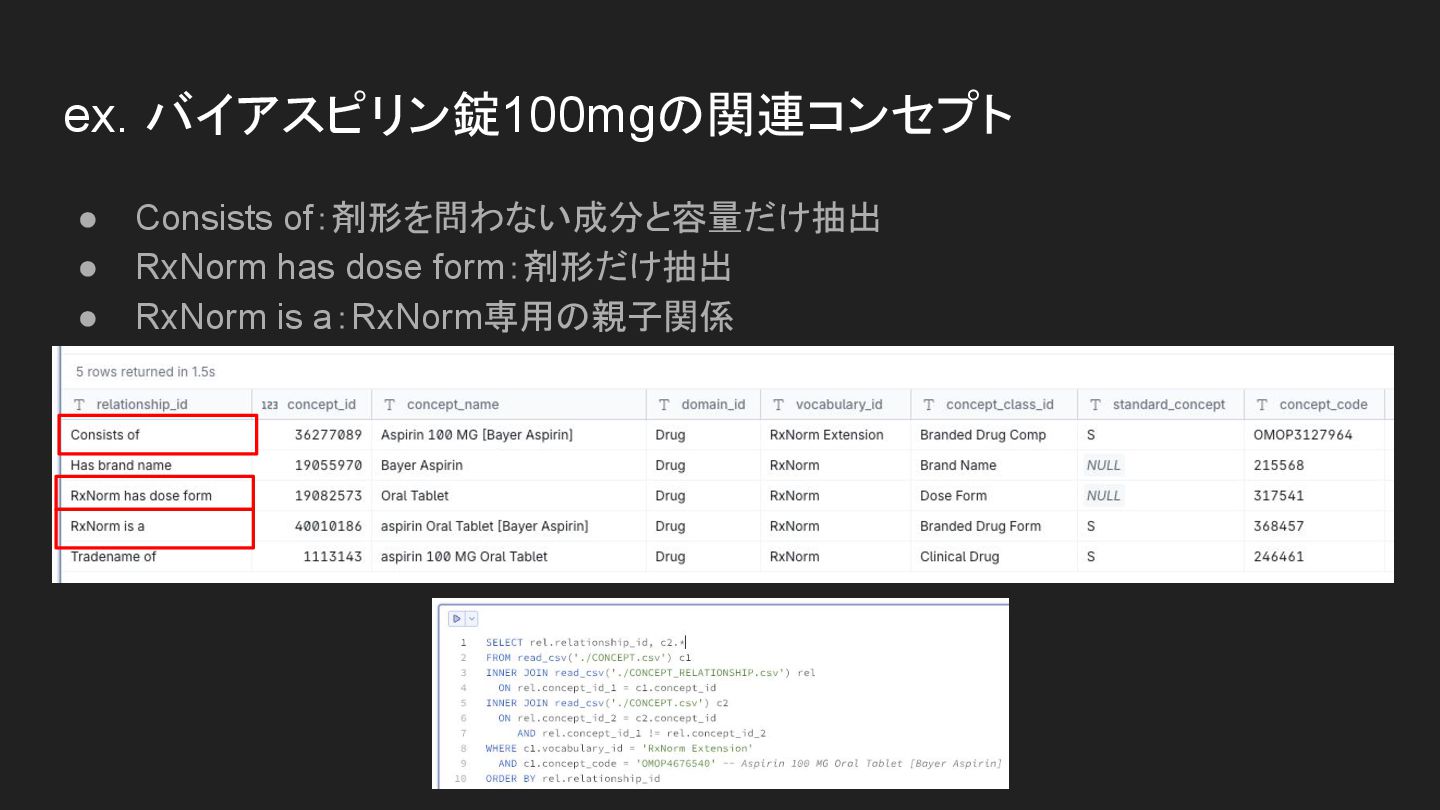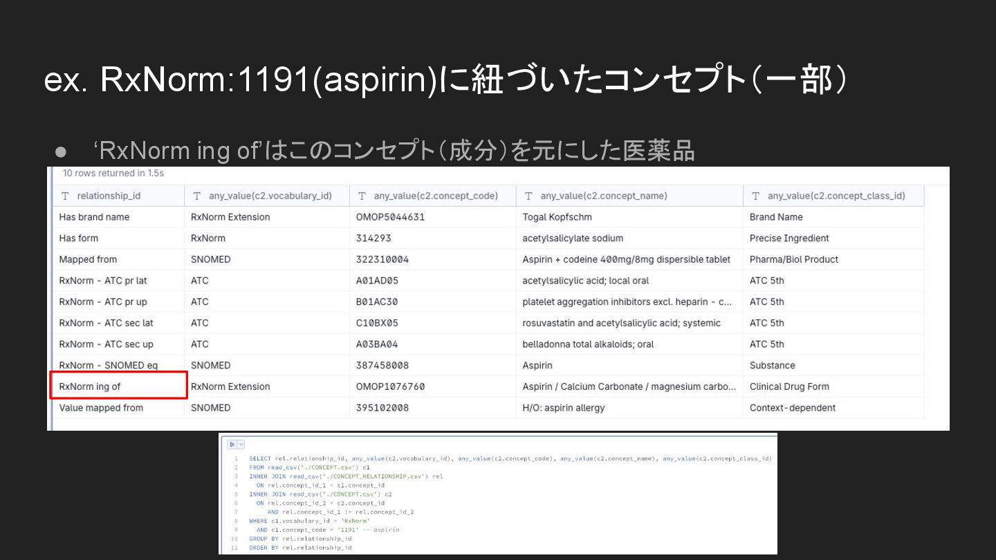 ex. RxNorm:1191(aspirin)に紐づいたコンセプト(一部) • ‘RxNorm ing of’はこのコンセプト(成分)を元にした医薬品