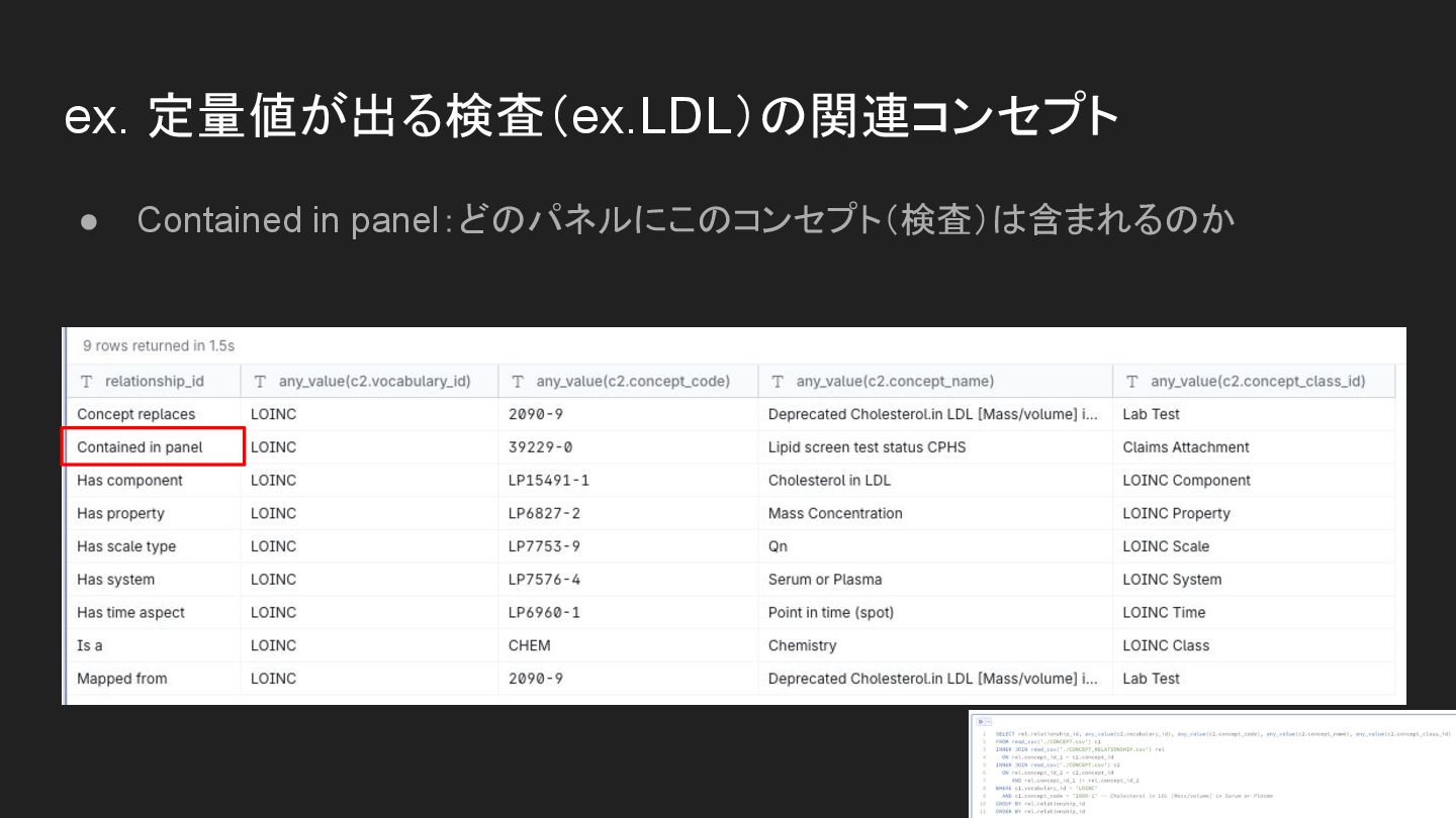ex. 定量値が出る検査(ex.LDL)の関連コンセプト • Contained in panel:どのパネルにこのコンセプト(検査)は含まれるのか