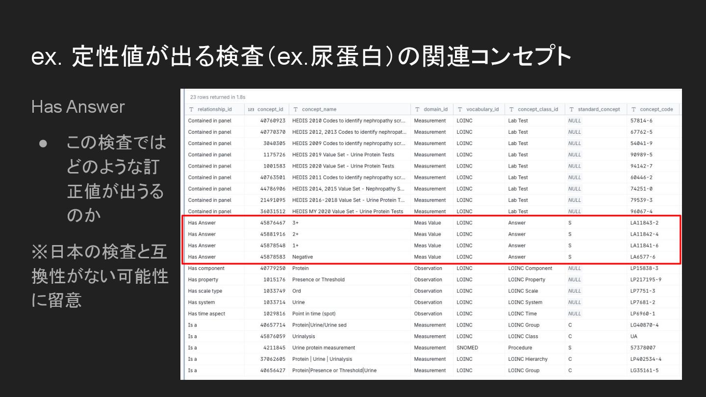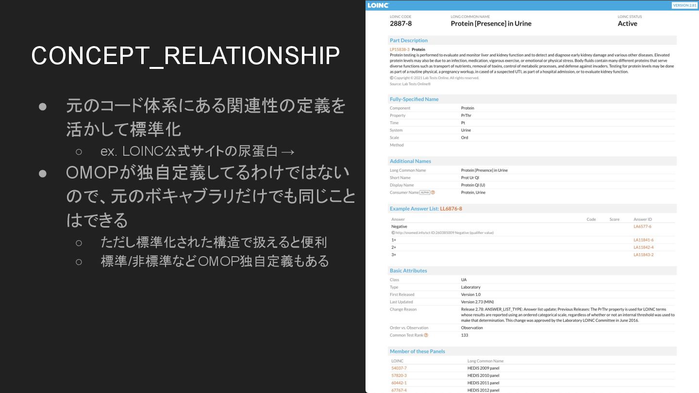 • 元のコード体系にある関連性の定義を 活かして標準化 ◦ ex. LOINC公式サイトの尿蛋白 → • OMOPが独自定義してるわけではない ので、元のボキャブラリだけでも同じこと