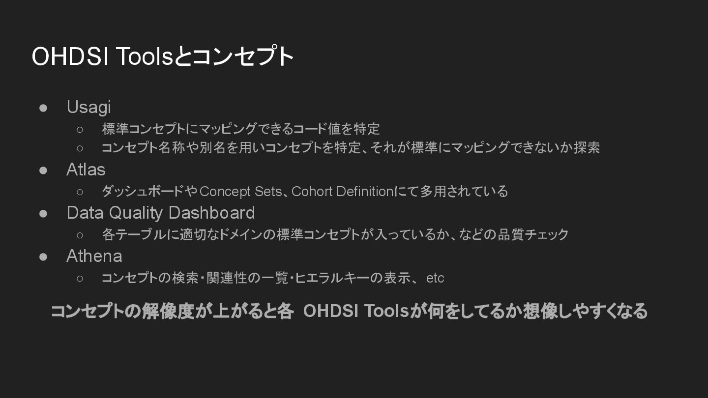 Sets、Cohort Definitionにて多用されている • Data Quality Dashboard ◦ 各テーブルに適切なドメインの標準コンセプトが入っているか、などの品質チェック • Athena ◦ コンセプトの検索・関連性の一覧・ヒエラルキーの表示、 etc コンセプトの解像度が上がると各 OHDSI Toolsが何をしてるか想像しやすくなる OHDSI Toolsとコンセプト