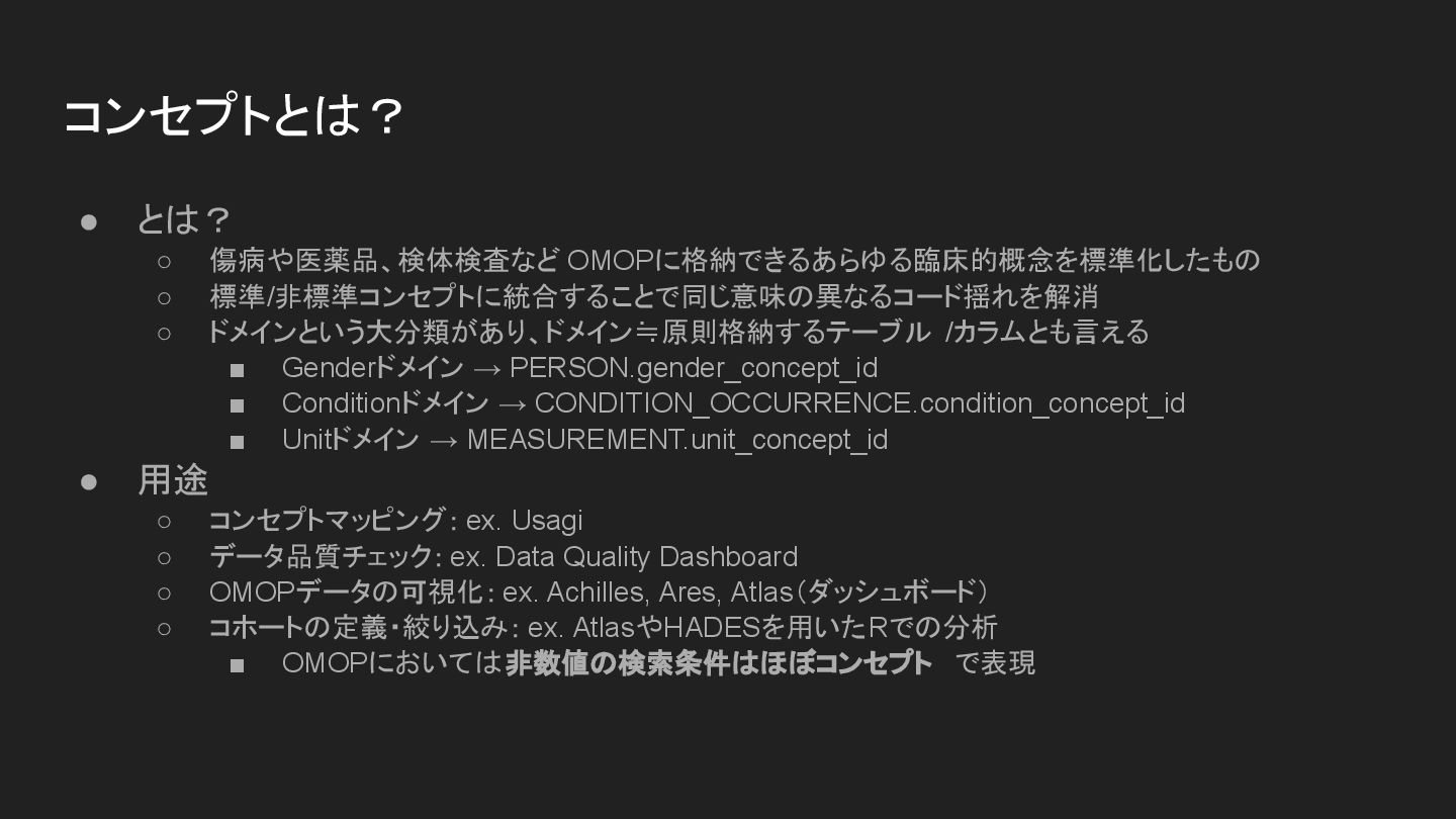 ▪ Genderドメイン → PERSON.gender_concept_id ▪ Conditionドメイン → CONDITION_OCCURRENCE.condition_concept_id ▪ Unitドメイン → MEASUREMENT.unit_concept_id • 用途 ◦ コンセプトマッピング: ex. Usagi ◦ データ品質チェック: ex. Data Quality Dashboard ◦ OMOPデータの可視化:ex. Achilles, Ares, Atlas(ダッシュボード) ◦ コホートの定義・絞り込み: ex. AtlasやHADESを用いたRでの分析 ▪ OMOPにおいては非数値の検索条件はほぼコンセプト で表現 コンセプトとは?