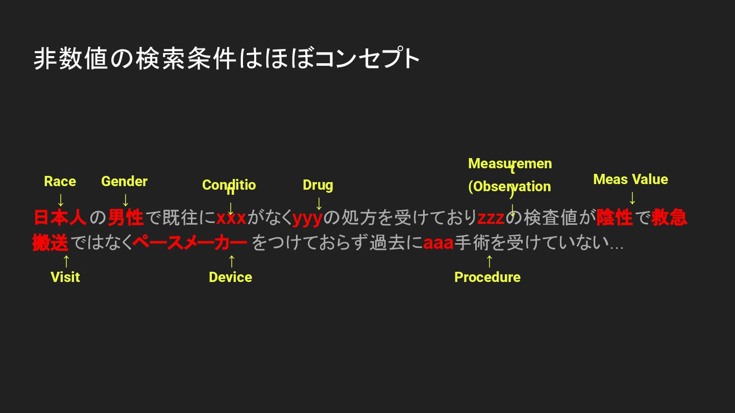 日本人の男性で既往にxxxがなくyyyの処方を受けておりzzzの検査値が陰性で救急 搬送ではなくペースメーカー をつけておらず過去にaaa手術を受けていない... 非数値の検索条件はほぼコンセプト Gender ↓ Measuremen t (Observation )