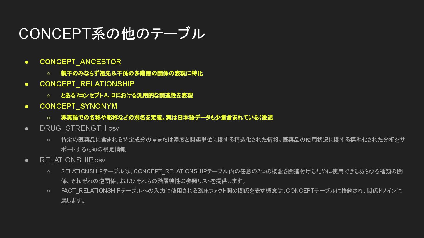 CONCEPT_SYNONYM ◦ 非英語での名称や略称などの別名を定義。実は日本語データも少量含まれている(後述 • DRUG_STRENGTH.csv ◦ 特定の医薬品に含まれる特定成分の量または濃度と関連単位に関する構造化された情報。医薬品の使用状況に関する標準化された分析をサ ポートするための補足情報 • RELATIONSHIP.csv ◦ RELATIONSHIPテーブルは、CONCEPT_RELATIONSHIPテーブル内の任意の2つの概念を関連付けるために使用できるあらゆる種類の関 係、それぞれの逆関係、およびそれらの階層特性の参照リストを提供します。 ◦ FACT_RELATIONSHIPテーブルへの入力に使用される臨床ファクト間の関係を表す概念は、CONCEPTテーブルに格納され、関係ドメインに 属します。 CONCEPT系の他のテーブル