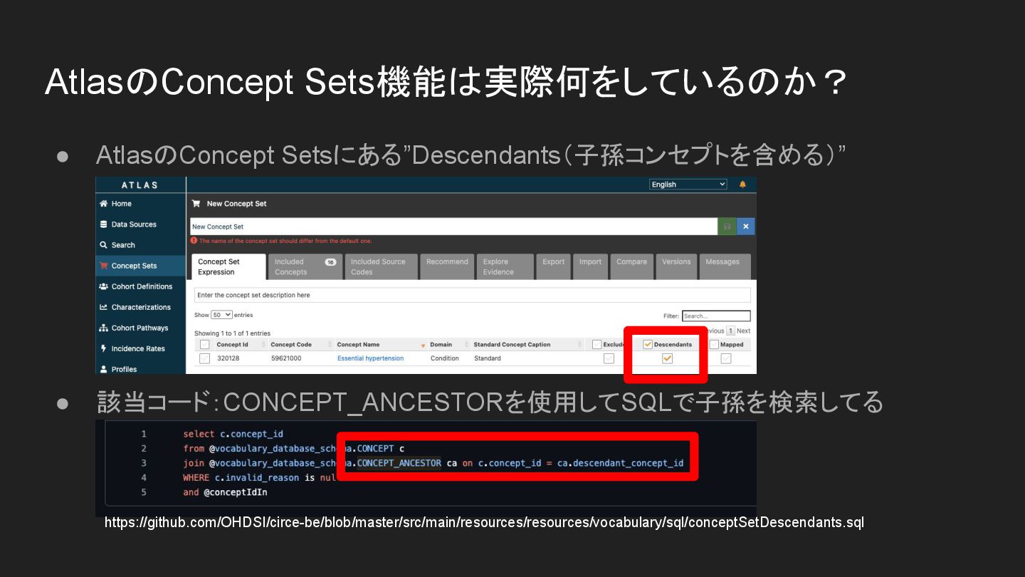 AtlasのConcept Sets機能は実際何をしているのか? • AtlasのConcept Setsにある”Descendants(子孫コンセプトを含める)” • 該当コード:CONCEPT_ANCESTORを使用してSQLで子孫を検索してる https://github.com/OHDSI/circe-be/blob/master/src/main/resources/resources/vocabulary/sql/conceptSetDescendants.sql