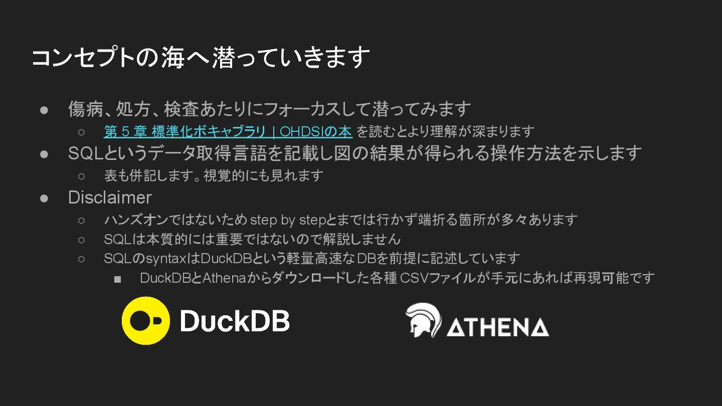 • SQLというデータ取得言語を記載し図の結果が得られる操作方法を示します ◦ 表も併記します。視覚的にも見れます • Disclaimer ◦ ハンズオンではないため step by stepとまでは行かず端折る箇所が多々あります ◦ SQLは本質的には重要ではないので解説しません ◦ SQLのsyntaxはDuckDBという軽量高速なDBを前提に記述しています ▪ DuckDBとAthenaからダウンロードした各種 CSVファイルが手元にあれば再現可能です コンセプトの海へ潜っていきます