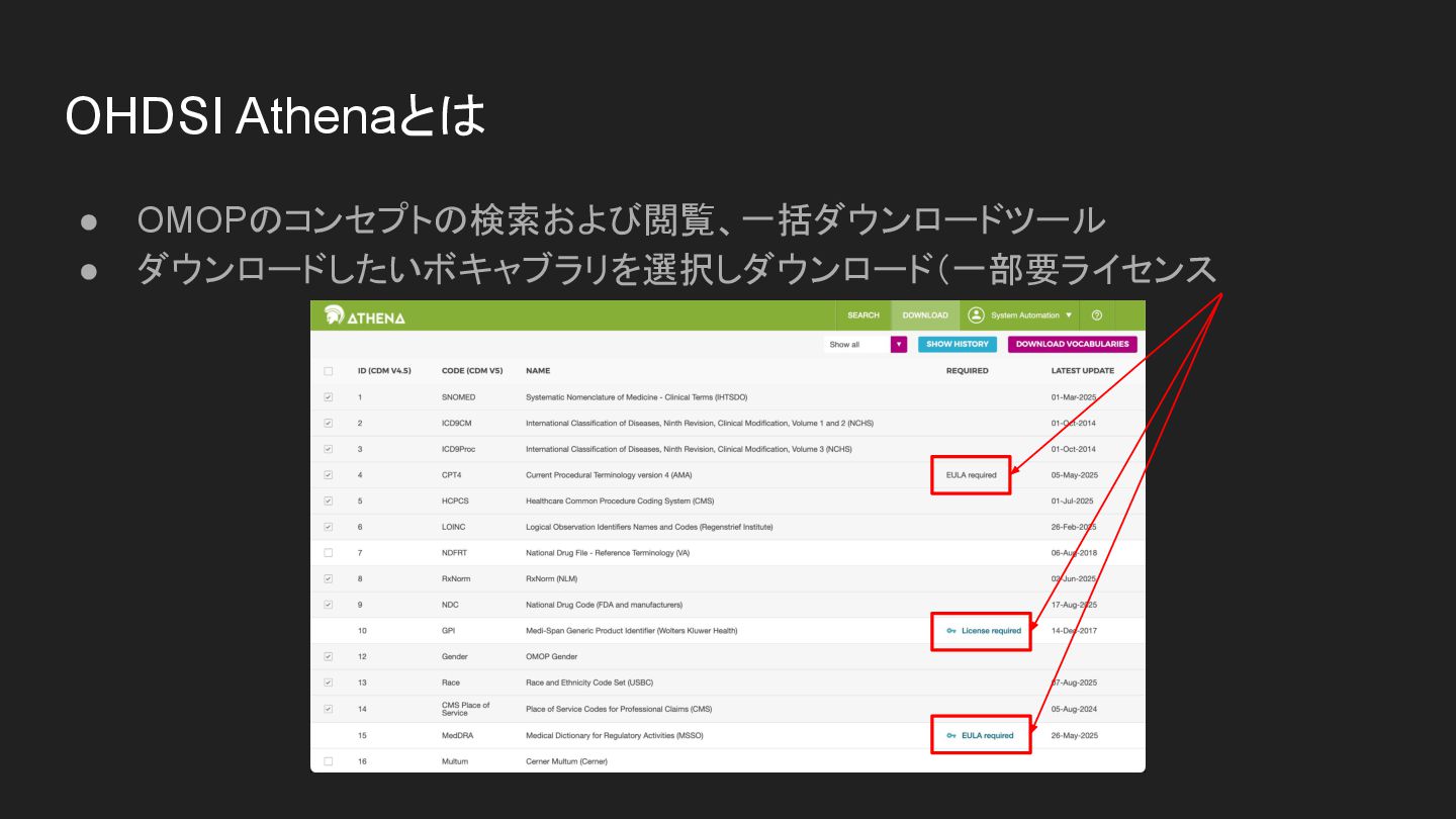 OHDSI Athenaとは • OMOPのコンセプトの検索および閲覧、一括ダウンロードツール • ダウンロードしたいボキャブラリを選択しダウンロード(一部要ライセンス