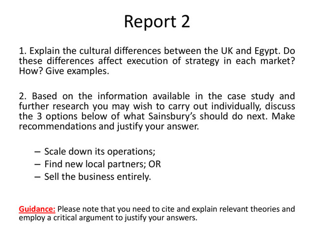 and Egypt. Do these differences affect execution of strategy in each market? How? Give examples. 2. Based on the information available in the case study and further research you may wish to carry out individually, discuss the 3 options below of what Sainsbury’s should do next. Make recommendations and justify your answer. – Scale down its operations; – Find new local partners; OR – Sell the business entirely. Guidance: Please note that you need to cite and explain relevant theories and employ a critical argument to justify your answers.