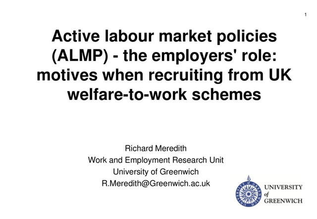 Organisational Perspectives.pdf. SAGE Publications. • Bonoli, G., 2010. Active labour market policy and social investment: a changing relationship. • Breaugh, J.A., 2008. Employee recruitment: Current knowledge and important areas for future research. Human Resource Management Review 18, 103–118. doi:10.1016/j.hrmr.2008.07.003 • Brown, W., Marsden, D., 2010. CEP Discussion Paper No 1037 December 2010 Individualisation and Growing Diversity of Employment Relationships William Brown and David Marsden. • Card, D., Kluve, J., Weber, A., 2015. What Works? A Meta Analysis of Recent Active Labor Market Program Evaluations. • Clegg, R., 2015. Monthly Labour Market Statistics - geographical coverage: UK. • Dean, H., 2013. The translation of needs into rights: Reconceptualising social citizenship as a global phenomenon: The translation of needs into rights. International Journal of Social Welfare 22, S32–S49. doi:10.1111/ijsw.12032 • Devins, D., Bickerstaffe, T., Nunn, A., Mitchell, B., McQuaid, R., 2011. The Role of Skills from Worklessness to Sustainable Employment with Progression. (No. 38). UK Commission for Employment and Skills, Wath-upon-Dearne. • Edwards, P., Gilman, M., Ram, M., Arrowsmith, J., 2002. Public Policy, the Performance of Firms, and the “Missing Middle”: The Case of the Employment Regulations, and a Role for Local Business Networks. Policy Studies 23, 5–20. doi:10.1080/0144287022000000055 • Grugulis, I., 2007. Skills, training and human resource development: a critical text. Palgrave Macmillan, Basingstoke [England]; New York. • Hasluck, C., 2011. Employers and the recruitment of unemployed people: an evidence review. • Ingold, J., Stuart, M., 2014. Employer Engagement in the Work Programme (No. 5). Centre for Employment Relations Innovation & Change, Leeds University Business School, Leeds. • Martin, C.J., 2004. REINVENTING WELFARE REGIMES Employers and the Implementation of Active Social Policy. World Politics 57, 39–69. • Martin, C.J., Swank, D., 2004. Does the organization of capital matter? Employers and active labor market policy at the national and firm levels. American Political Science Review 98, 593–611. • Martin, J.P., 2015. Activation and active labour market policies in OECD countries: stylised facts and evidence on their effectiveness. IZA Journal of Labor Policy 4. doi:10.1186/s40173-015-0032-y • Meadows, P., 2006. What works with tackling worklessness? London Development Agency, London. • Miles, R.E., Snow, C.C., Meyer, A.D., Coleman, H.J., 1978. Organizational Strategy, Structure, and Process. The Academy of Management Review 3, 546. doi:10.2307/257544 • Niblett, R., Begg, I., Mushovel, F., 2015. The Welfare State in Europe: Visions for Reform (EU Research Paper). Chatham House: The Royal Institute of International Affairs. • Pike, A., Tomaney, J., McCarthy, A., 2012. Governing uneven development:: the politics of local and regional development in England, in: Regional Development Agencies: The Next Generation?: Networking, Knowledge and Regional Politics. Routledge, pp. 102–122. • Ployhart, R.E., 2006. Staffing in the 21st Century: New Challenges and Strategic Opportunities. Journal of Management 32, 868–897.