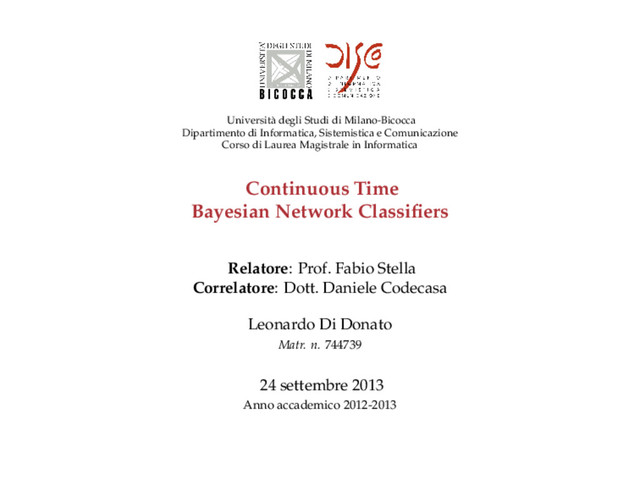 Comunicazione Corso di Laurea Magistrale in Informatica Continuous Time Bayesian Network Classifiers Relatore: Prof. Fabio Stella Correlatore: Dott. Daniele Codecasa Leonardo Di Donato Matr. n. 744739 24 settembre 2013 Anno accademico 2012-2013