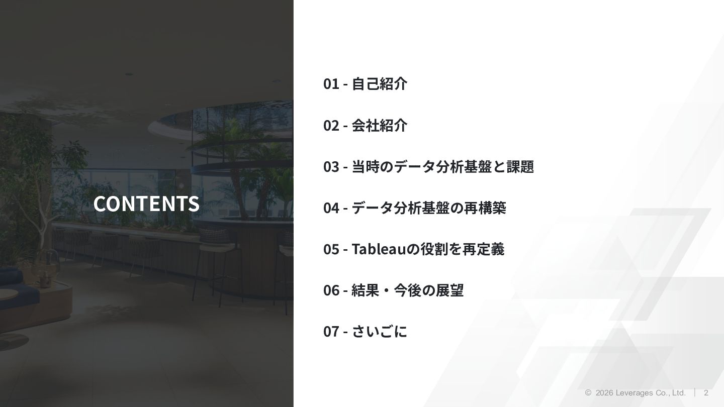 03 - 当時のデータ分析基盤と課題 04 - データ分析基盤の再構築 05 - Tableauの役割を再定義 06 - 結果‧今後の展望 02 - 会社紹介 07 - さいごに