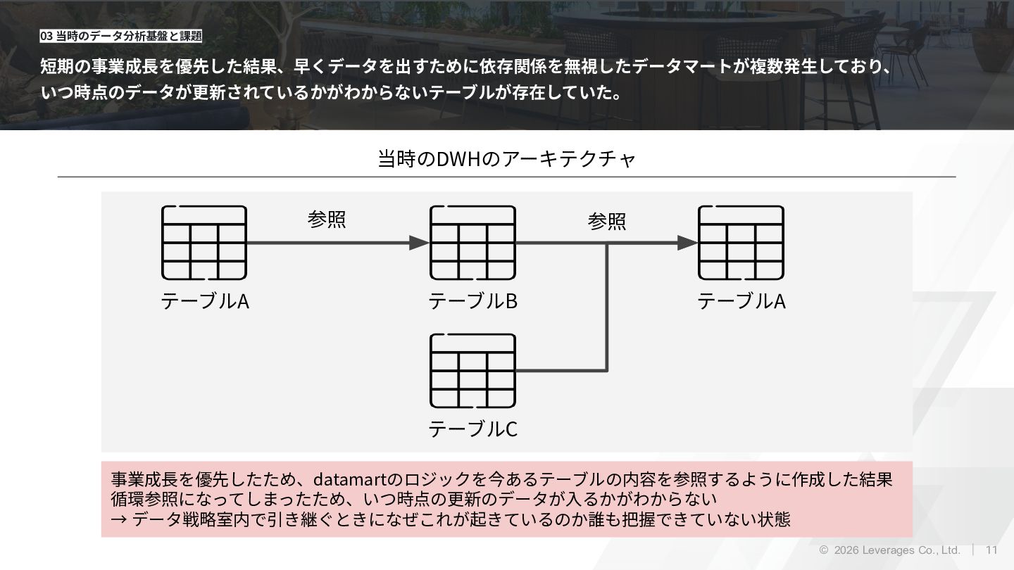 11 © 2026 Leverages Co., Ltd. 短期の事業成⻑を優先した結果、早くデータを出すために依存関係を無視したデータマートが複数発⽣しており、 いつ時点のデータが更新されているかがわからないテーブルが存在していた。 03 当時のデータ分析基盤と課題
