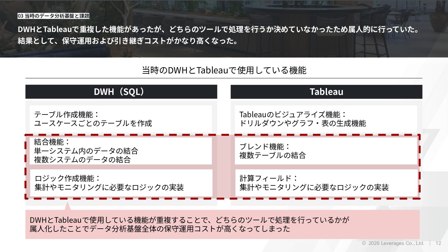 12 © 2026 Leverages Co., Ltd. DWHとTableauで重複した機能があったが、どちらのツールで処理を⾏うか決めていなかったため属⼈的に⾏っていた。 結果として、保守運⽤および引き継ぎコストがかなり⾼くなった。 03 当時のデータ分析基盤と課題