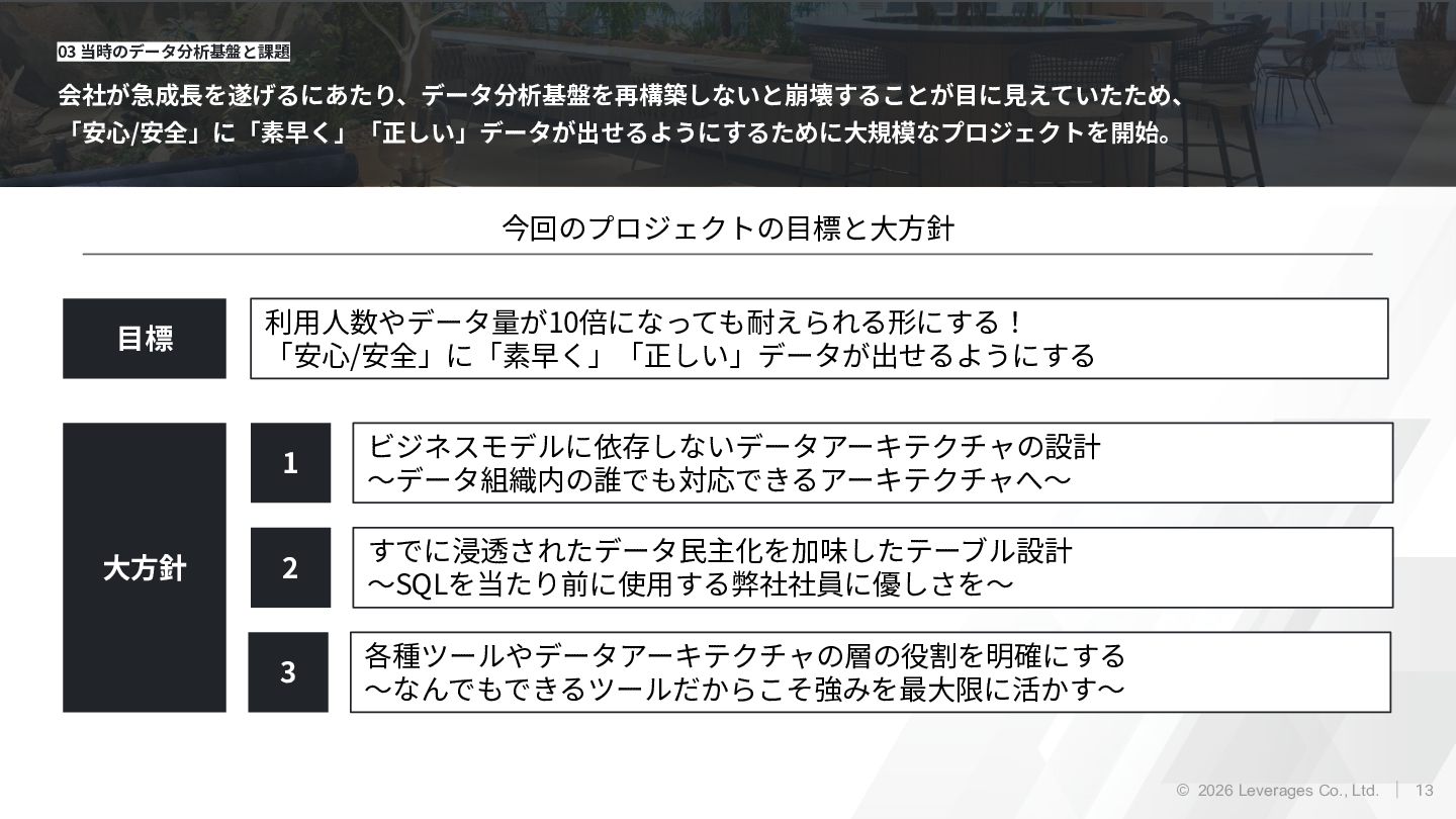 13 © 2026 Leverages Co., Ltd. 会社が急成⻑を遂げるにあたり、データ分析基盤を再構築しないと崩壊することが⽬に⾒えていたため、 「安⼼/安全」に「素早く」「正しい」データが出せるようにするために⼤規模なプロジェクトを開始。 03 当時のデータ分析基盤と課題