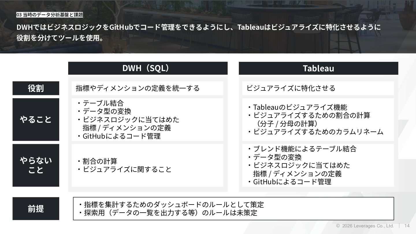 14 © 2026 Leverages Co., Ltd. DWHではビジネスロジックをGitHubでコード管理をできるようにし、Tableauはビジュアライズに特化させるように 役割を分けてツールを使⽤。 03 当時のデータ分析基盤と課題