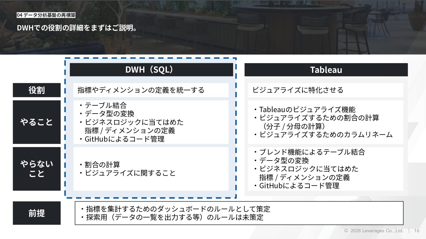 16 © 2026 Leverages Co., Ltd. DWHでの役割の詳細をまずはご説明。 04 データ分析基盤の再構築 DWH(SQL)