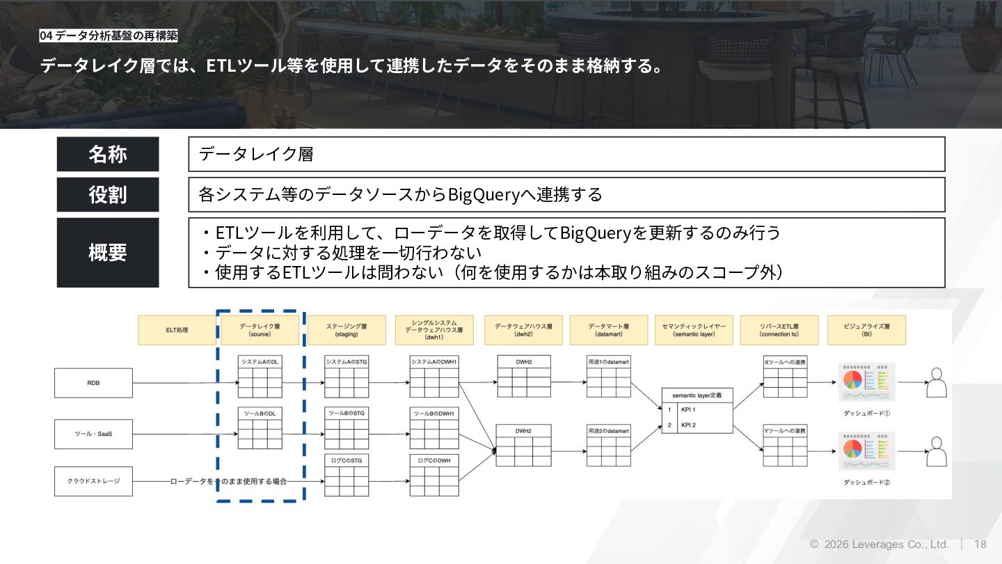 18 © 2026 Leverages Co., Ltd. データレイク層では、ETLツール等を使⽤して連携したデータをそのまま格納する。 04 データ分析基盤の再構築 ‧ETLツールを利⽤して、ローデータを取得してBigQueryを更新するのみ⾏う