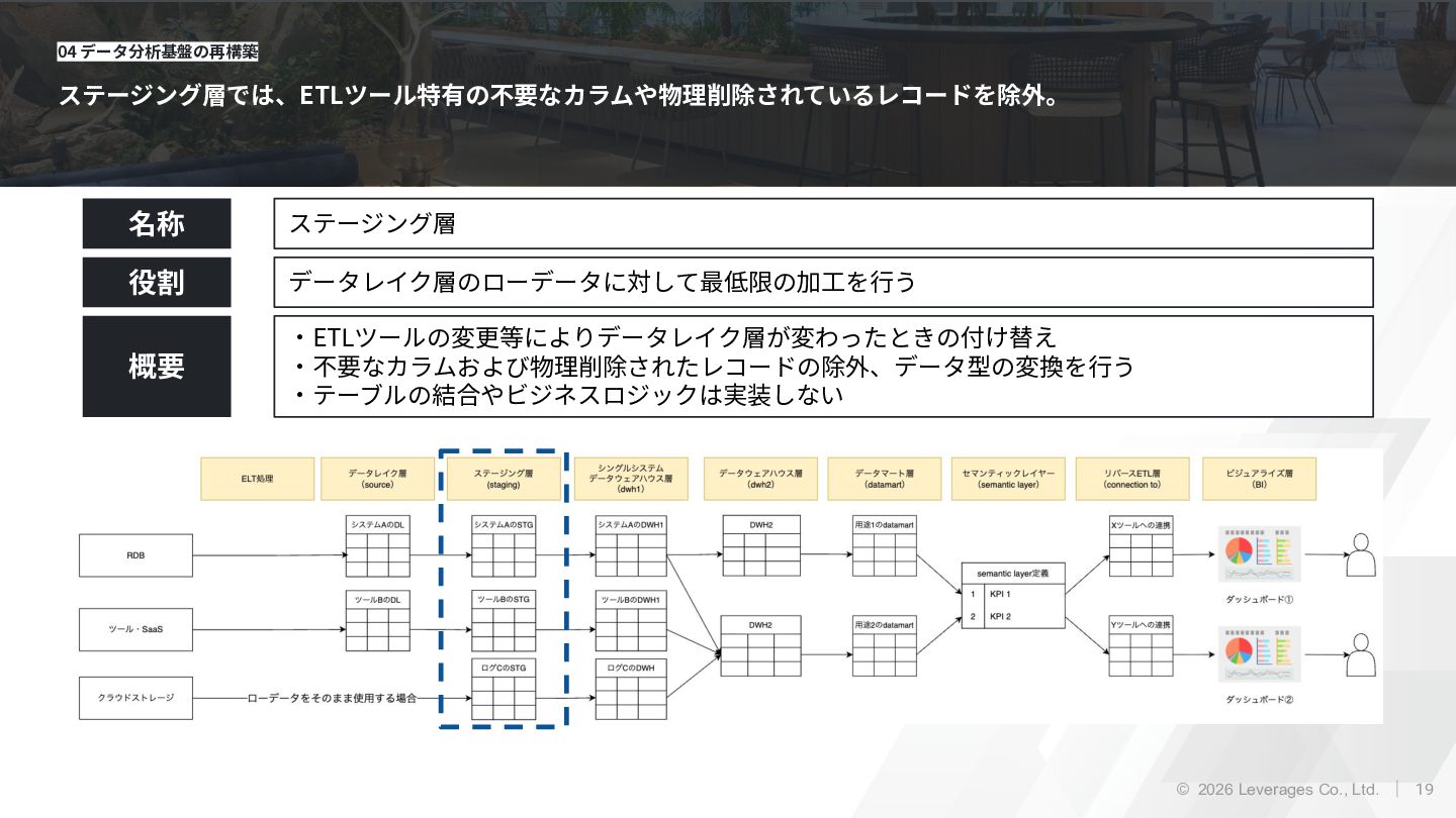 19 © 2026 Leverages Co., Ltd. ステージング層では、ETLツール特有の不要なカラムや物理削除されているレコードを除外。 04 データ分析基盤の再構築 ‧ETLツールの変更等によりデータレイク層が変わったときの付け替え