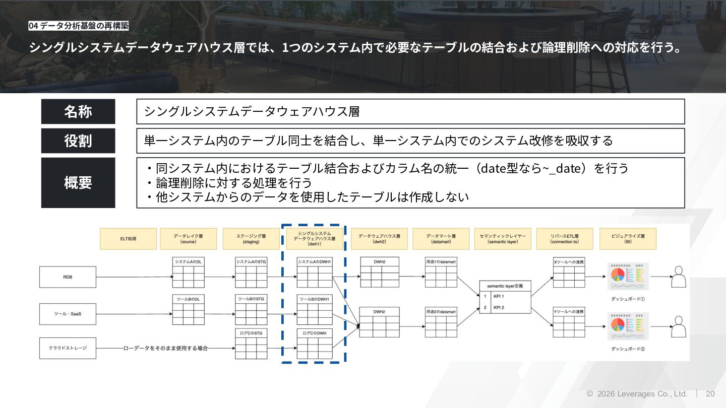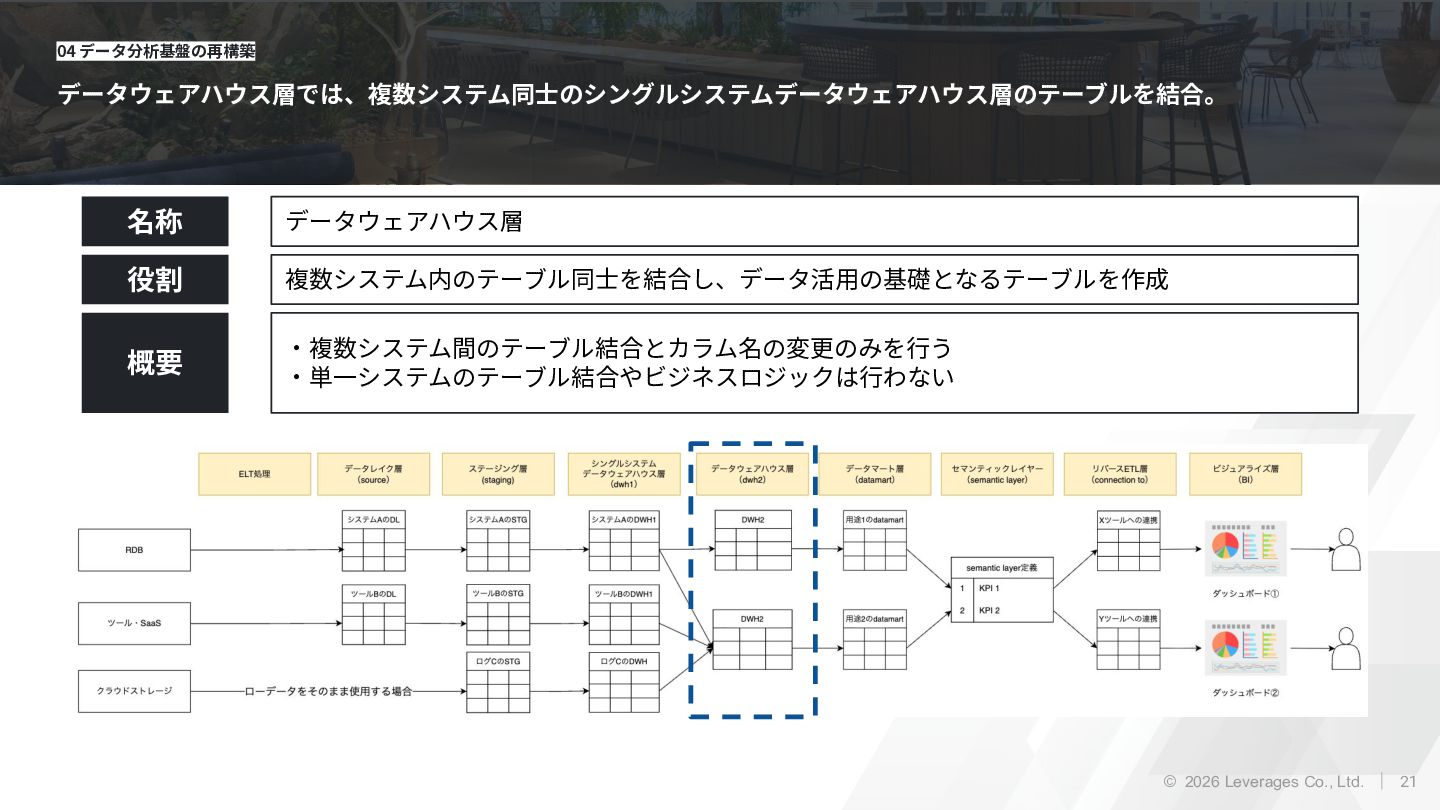 20 © 2026 Leverages Co., Ltd. シングルシステムデータウェアハウス層では、1つのシステム内で必要なテーブルの結合および論理削除への対応を⾏う。 04 データ分析基盤の再構築 ‧同システム内におけるテーブル結合およびカラム名の統⼀(date型なら~_date)を⾏う
