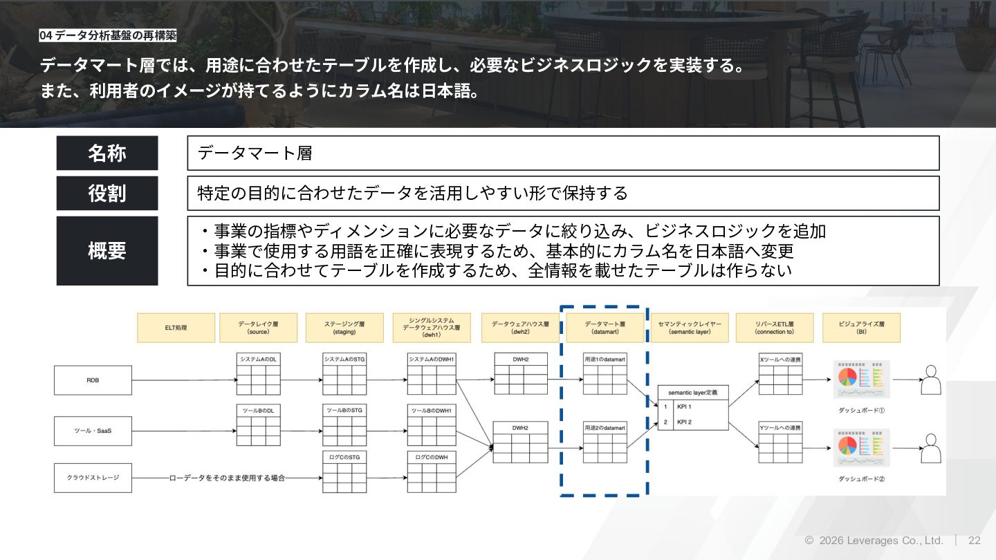 22 © 2026 Leverages Co., Ltd. データマート層では、⽤途に合わせたテーブルを作成し、必要なビジネスロジックを実装する。 また、利⽤者のイメージが持てるようにカラム名は⽇本語。 04 データ分析基盤の再構築