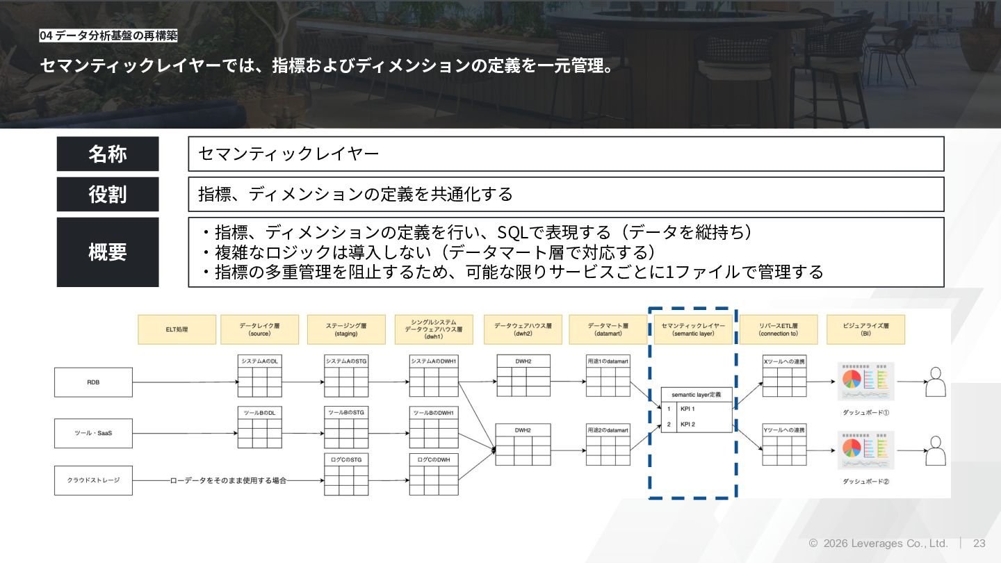 23 © 2026 Leverages Co., Ltd. セマンティックレイヤーでは、指標およびディメンションの定義を⼀元管理。 04 データ分析基盤の再構築 ‧指標、ディメンションの定義を⾏い、SQLで表現する(データを縦持ち)