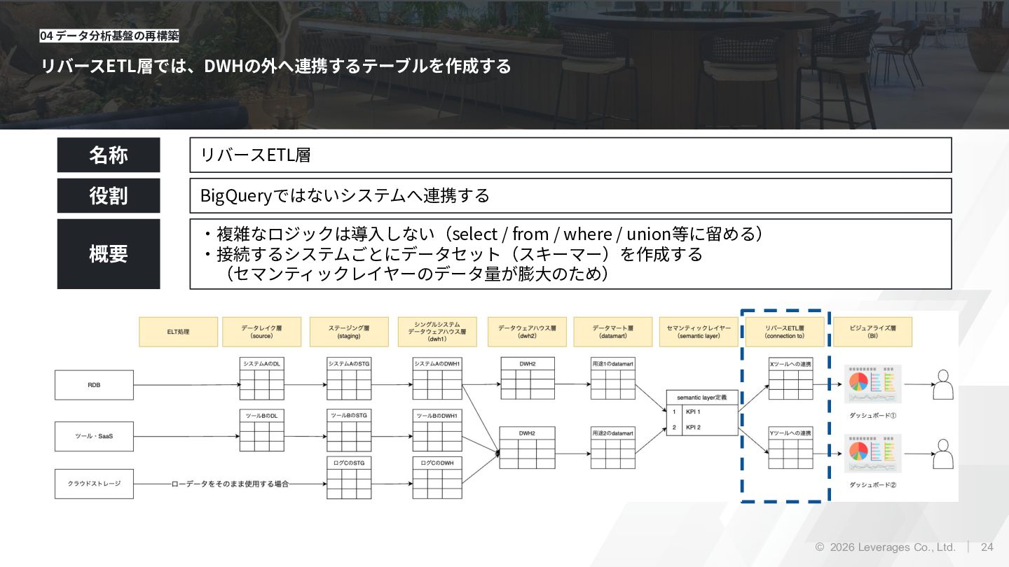 24 © 2026 Leverages Co., Ltd. リバースETL層では、DWHの外へ連携するテーブルを作成する 04 データ分析基盤の再構築 ‧複雑なロジックは導⼊しない(select
