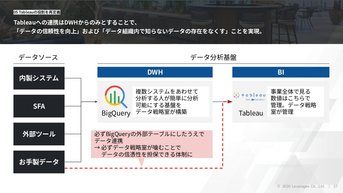 26 © 2026 Leverages Co., Ltd. Tableauでの役割を具体的にご説明。 05 Tableauの役割を再定義 DWH(SQL)