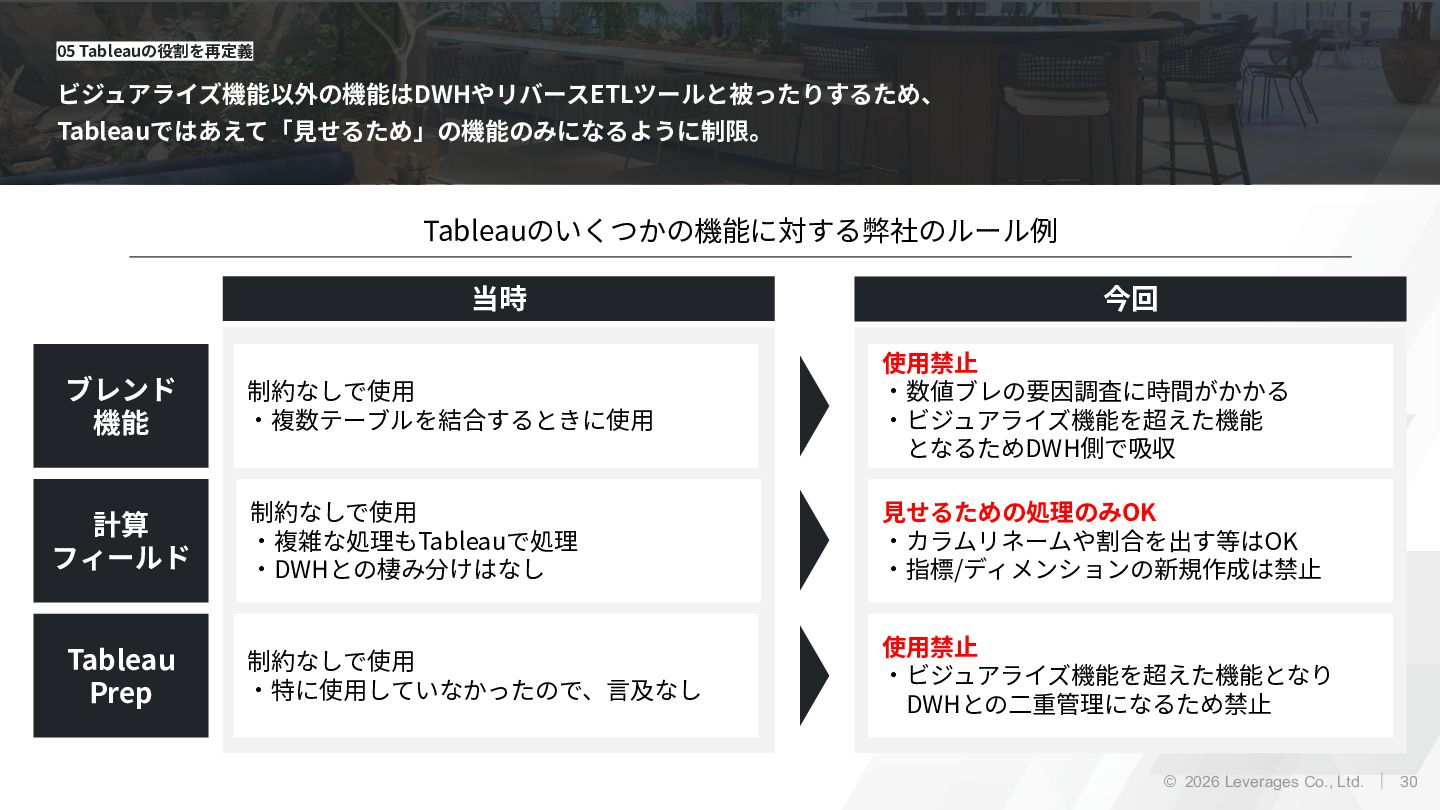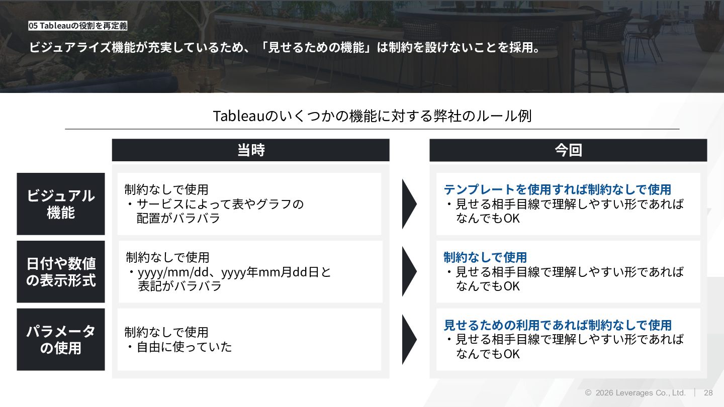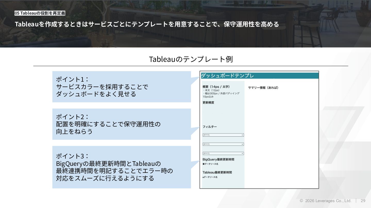 28 © 2026 Leverages Co., Ltd. ビジュアライズ機能が充実しているため、「⾒せるための機能」は制約を設けないことを採⽤。 05 Tableauの役割を再定義 当時