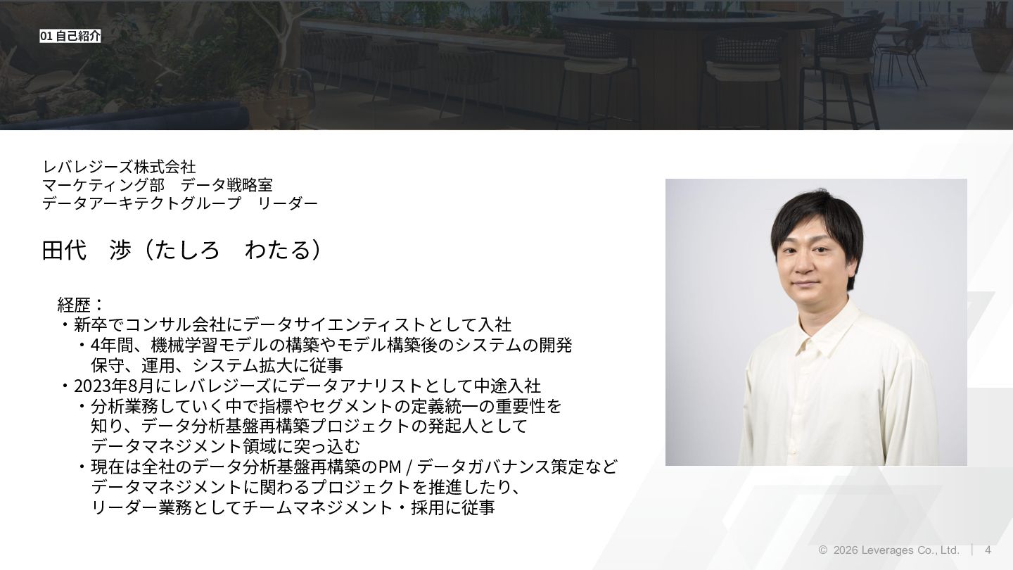 ‧4年間、機械学習モデルの構築やモデル構築後のシステムの開発 保守、運⽤、システム拡⼤に従事 ‧2023年8⽉にレバレジーズにデータアナリストとして中途⼊社 ‧分析業務していく中で指標やセグメントの定義統⼀の重要性を 知り、データ分析基盤再構築プロジェクトの発起⼈として データマネジメント領域に突っ込む ‧現在は全社のデータ分析基盤再構築のPM / データガバナンス策定など データマネジメントに関わるプロジェクトを推進したり、 リーダー業務としてチームマネジメント‧採⽤に従事 レバレジーズ株式会社 マーケティング部 データ戦略室 データアーキテクトグループ リーダー ⽥代 渉(たしろ わたる)