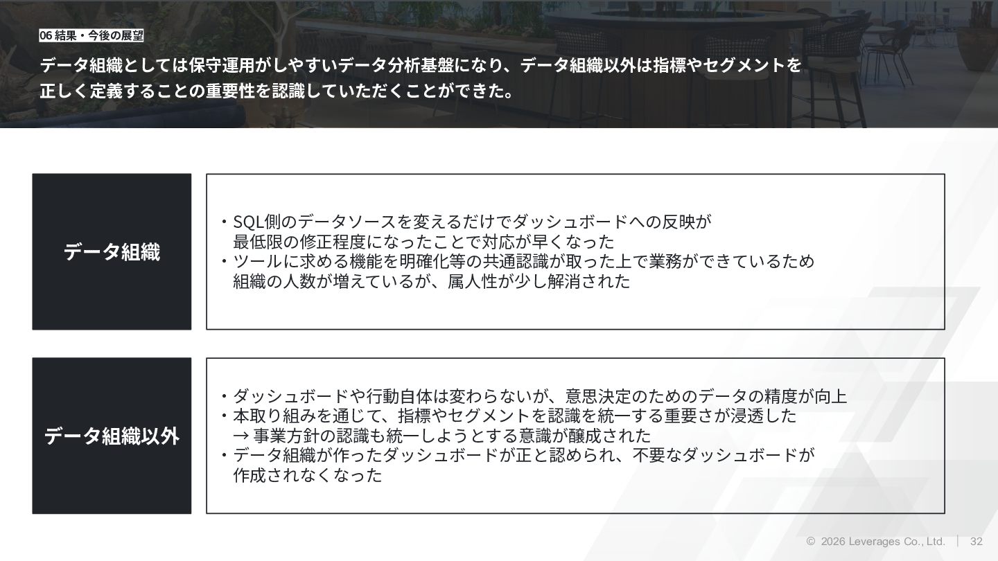 32 © 2026 Leverages Co., Ltd. データ組織としては保守運⽤がしやすいデータ分析基盤になり、データ組織以外は指標やセグメントを 正しく定義することの重要性を認識していただくことができた。 06 結果‧今後の展望