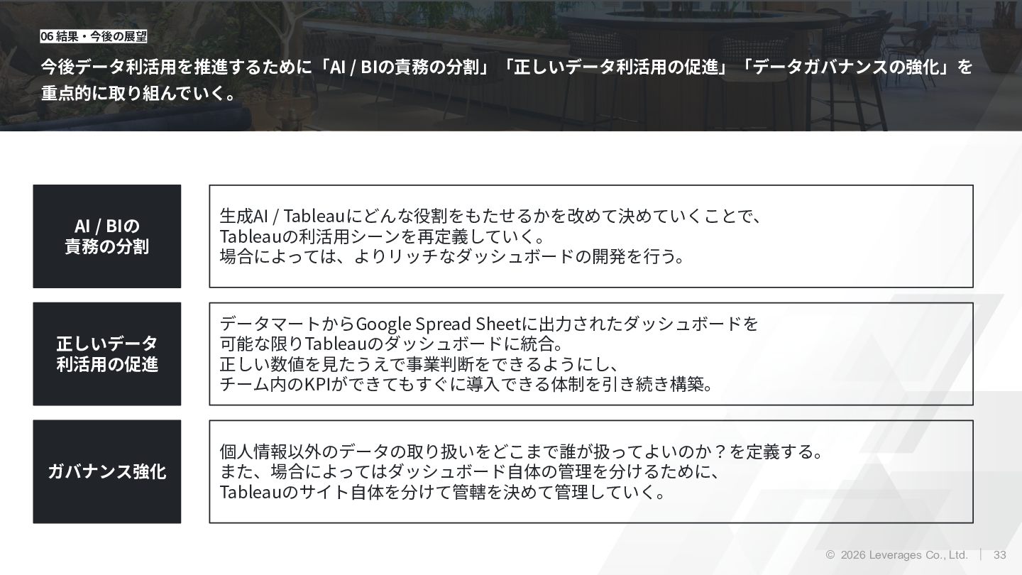 33 © 2026 Leverages Co., Ltd. 今後データ利活⽤を推進するために「AI / BIの責務の分割」「正しいデータ利活⽤の促進」「データガバナンスの強化」を 重点的に取り組んでいく。