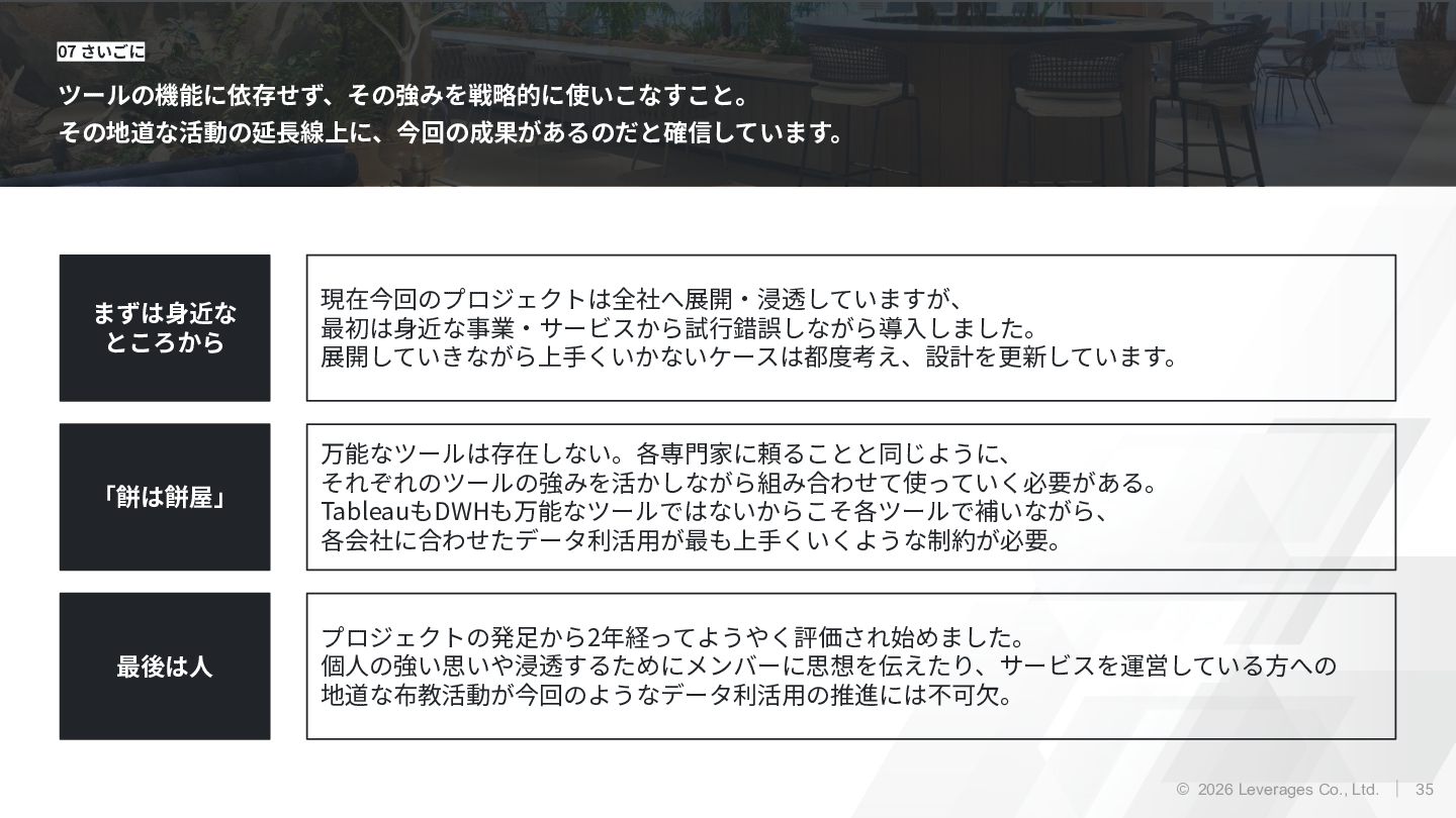 35 © 2026 Leverages Co., Ltd. ツールの機能に依存せず、その強みを戦略的に使いこなすこと。 その地道な活動の延⻑線上に、今回の成果があるのだと確信しています。 07 さいごに